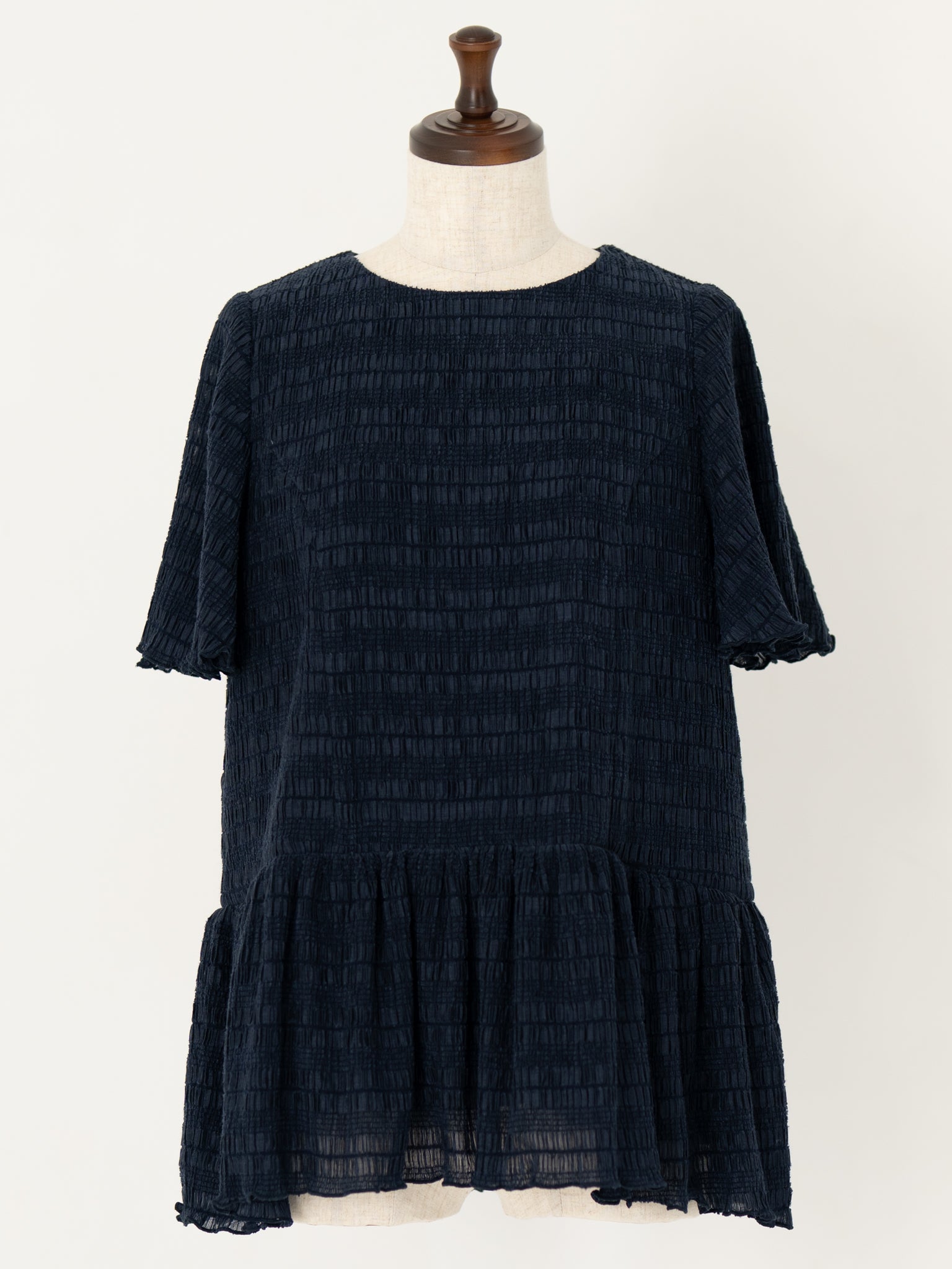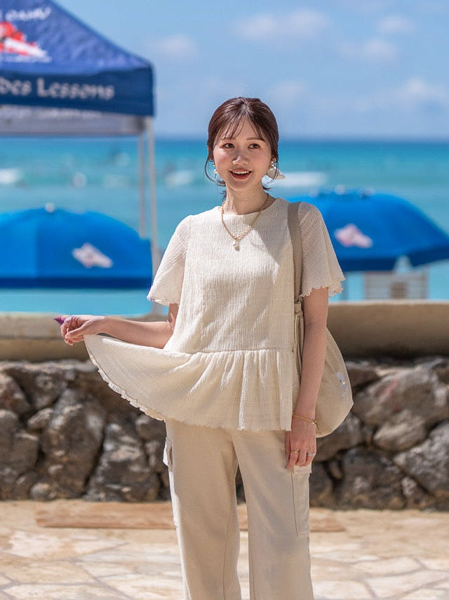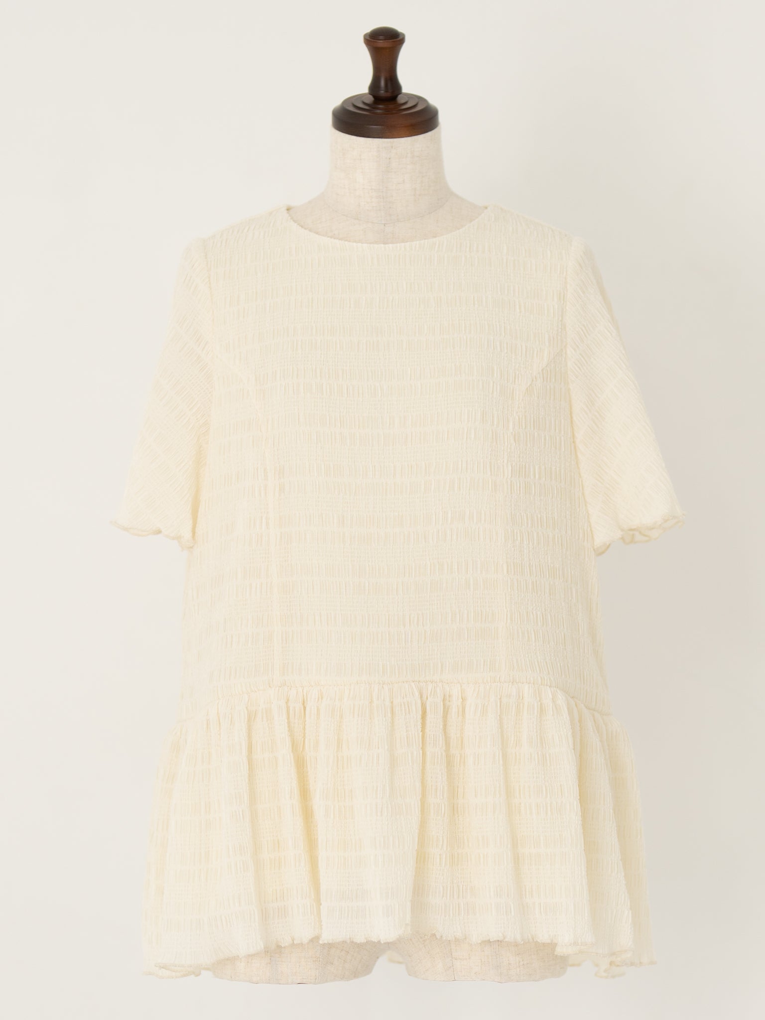 ウエスト位置のペプラムデザインがシルエットにメリハリを生み、細身からワイドまで、どんなパンツともバランスよく合わせていただけます。