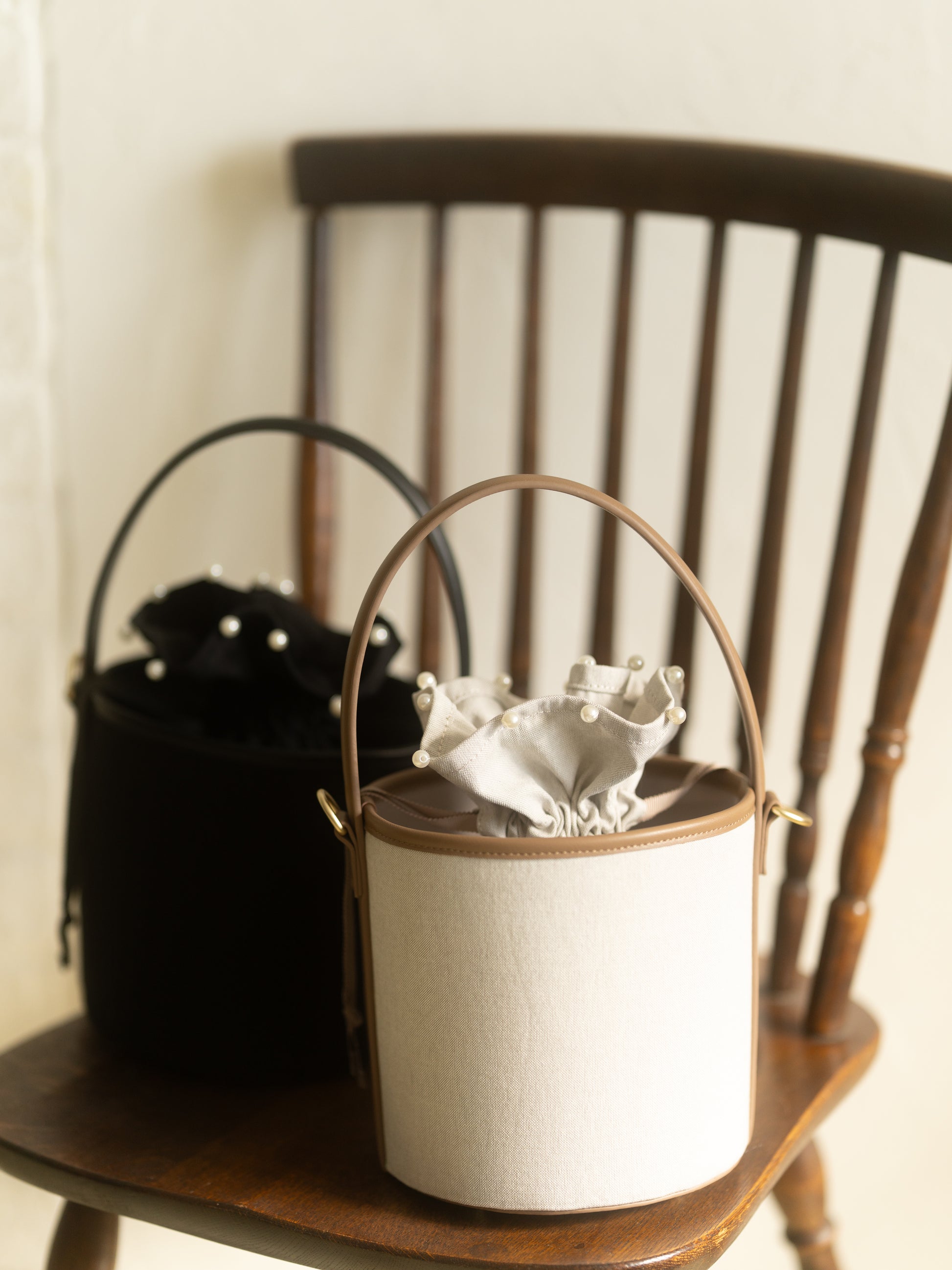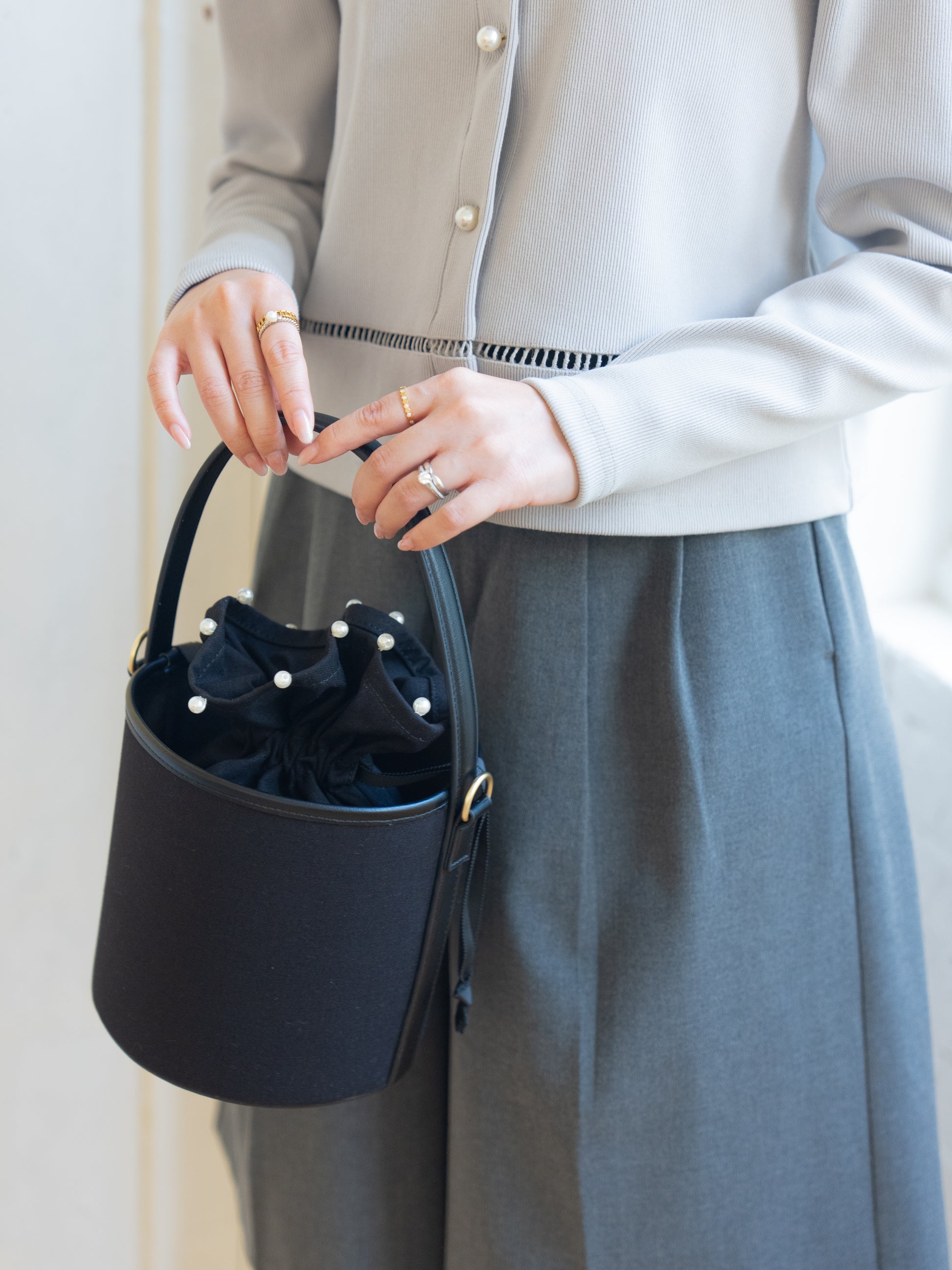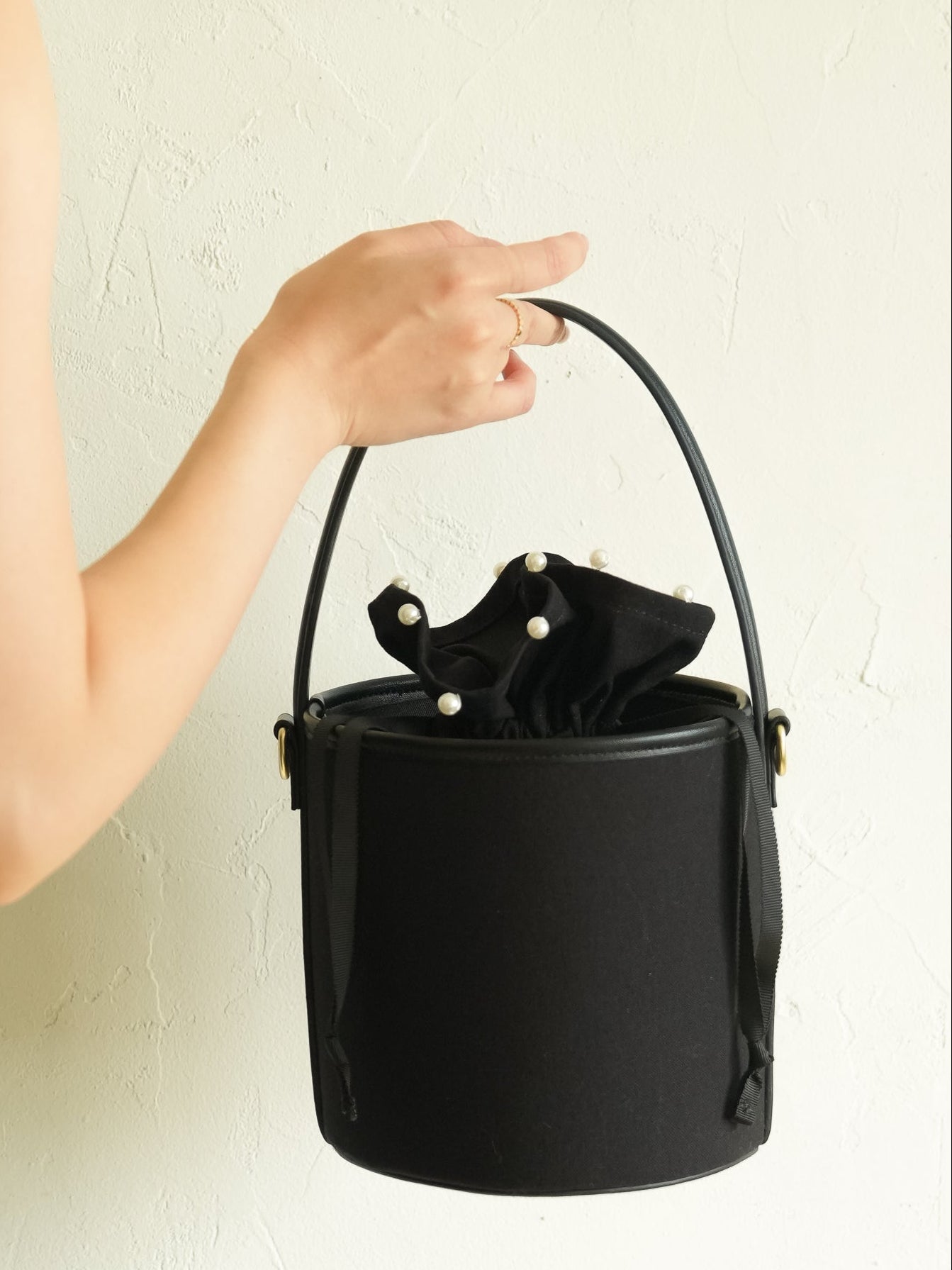 丸みのあるコロンとしたフォルムが愛らしいバケツバッグ。