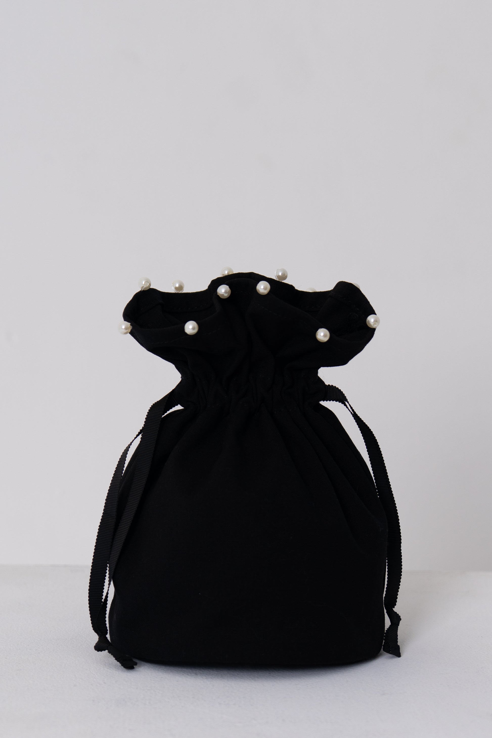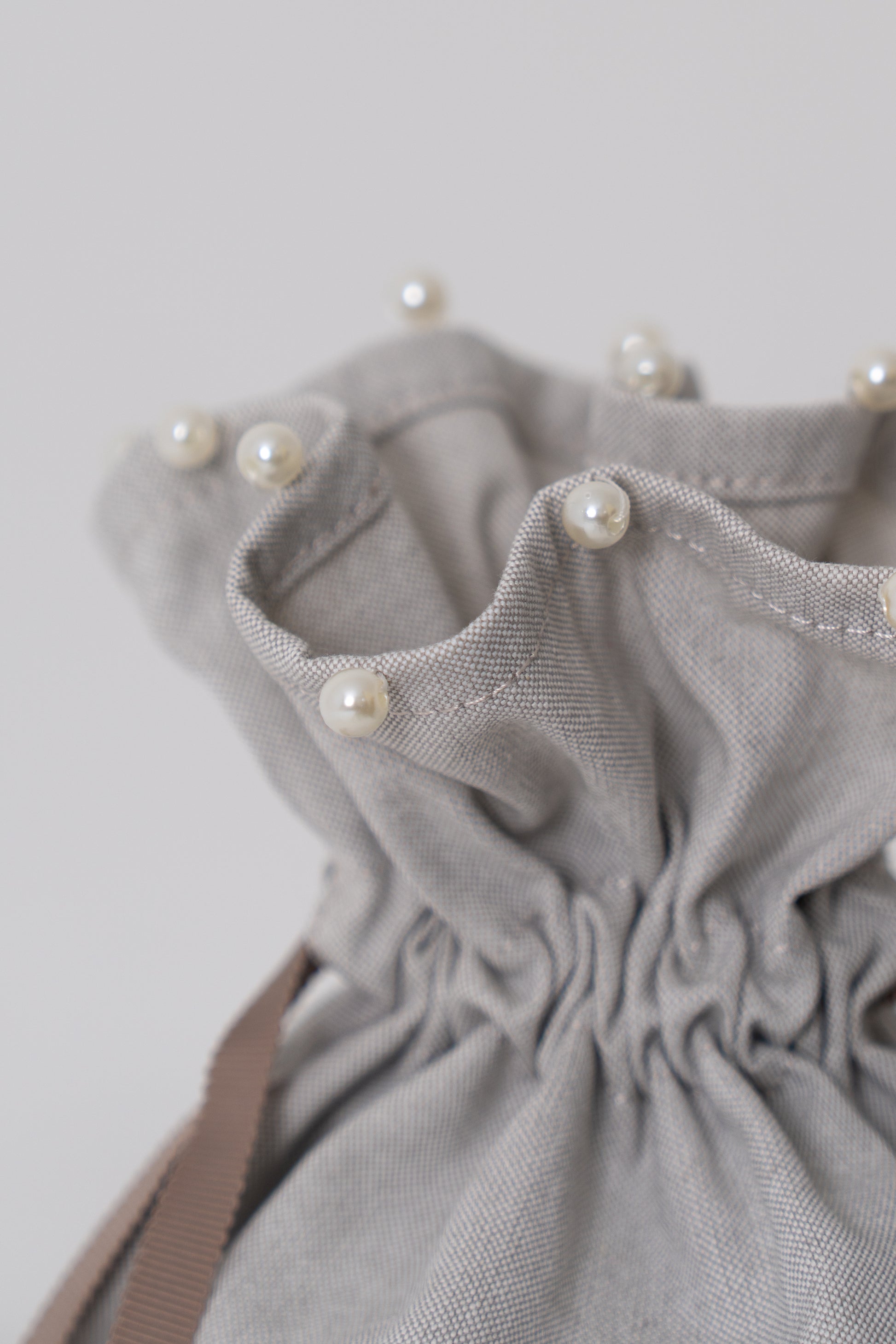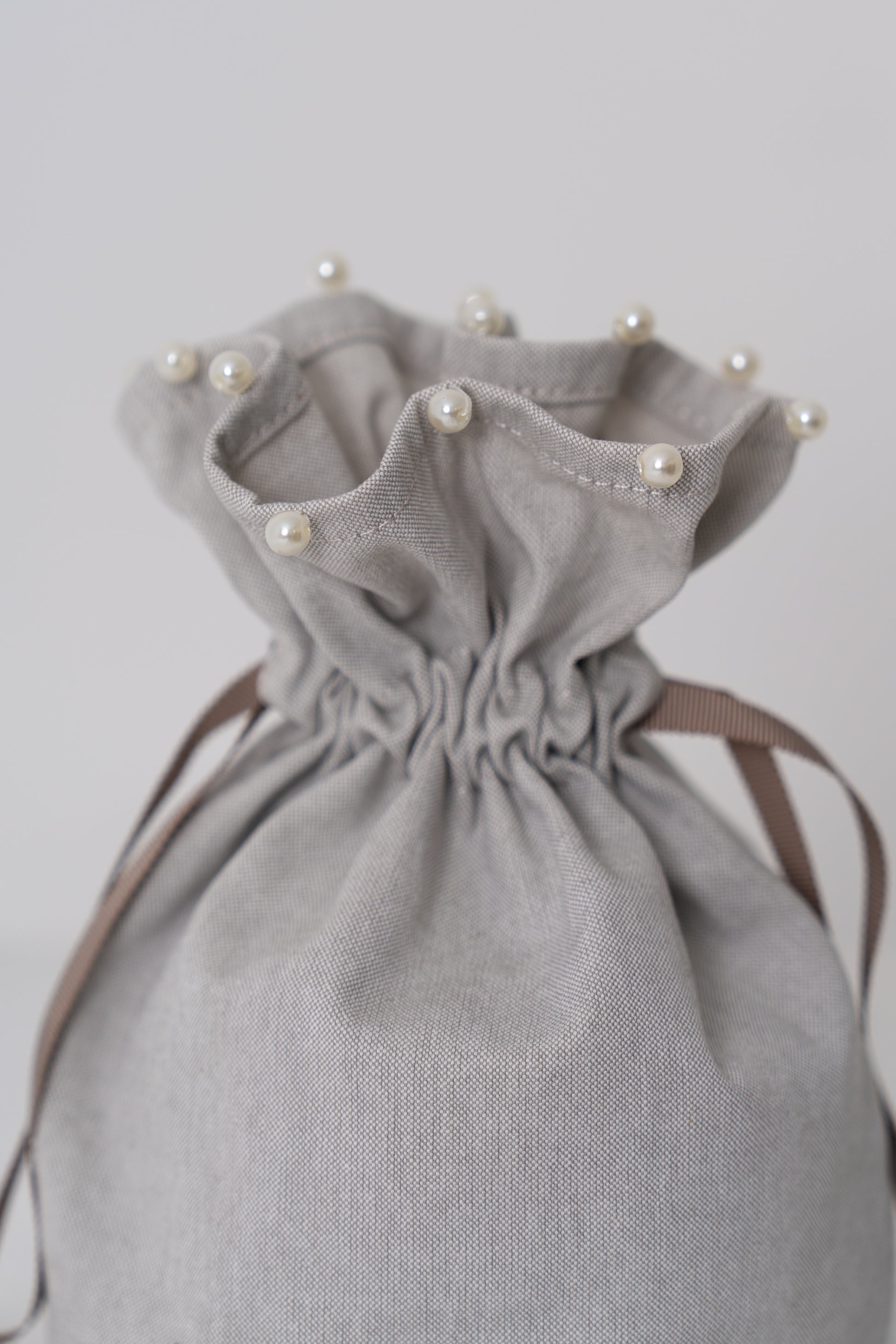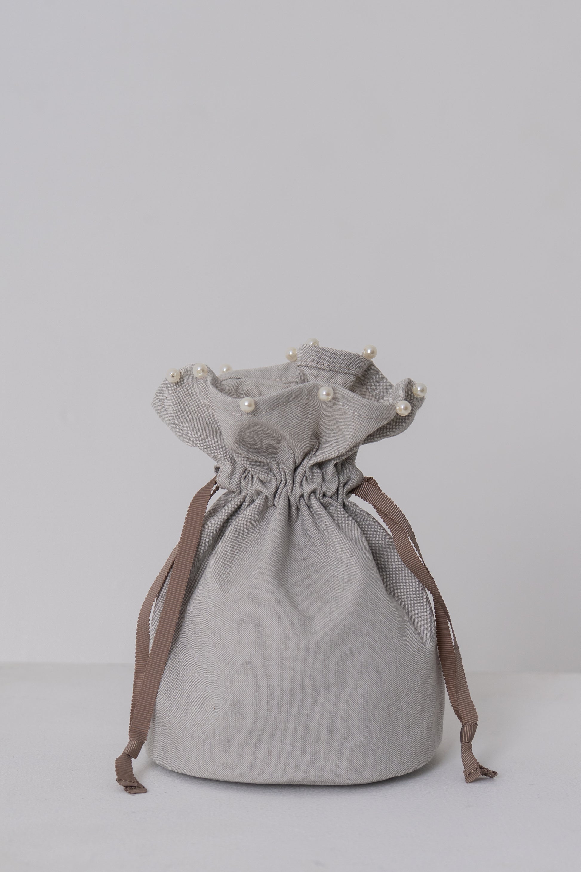 バッグに合わせて作られた共布の巾着は、上端にさりげないパールをあしらい、上品なアクセントに。