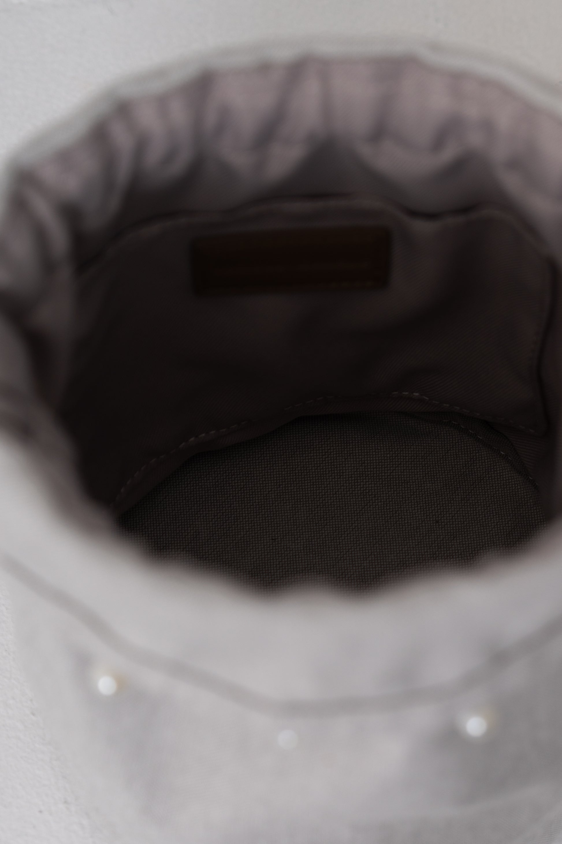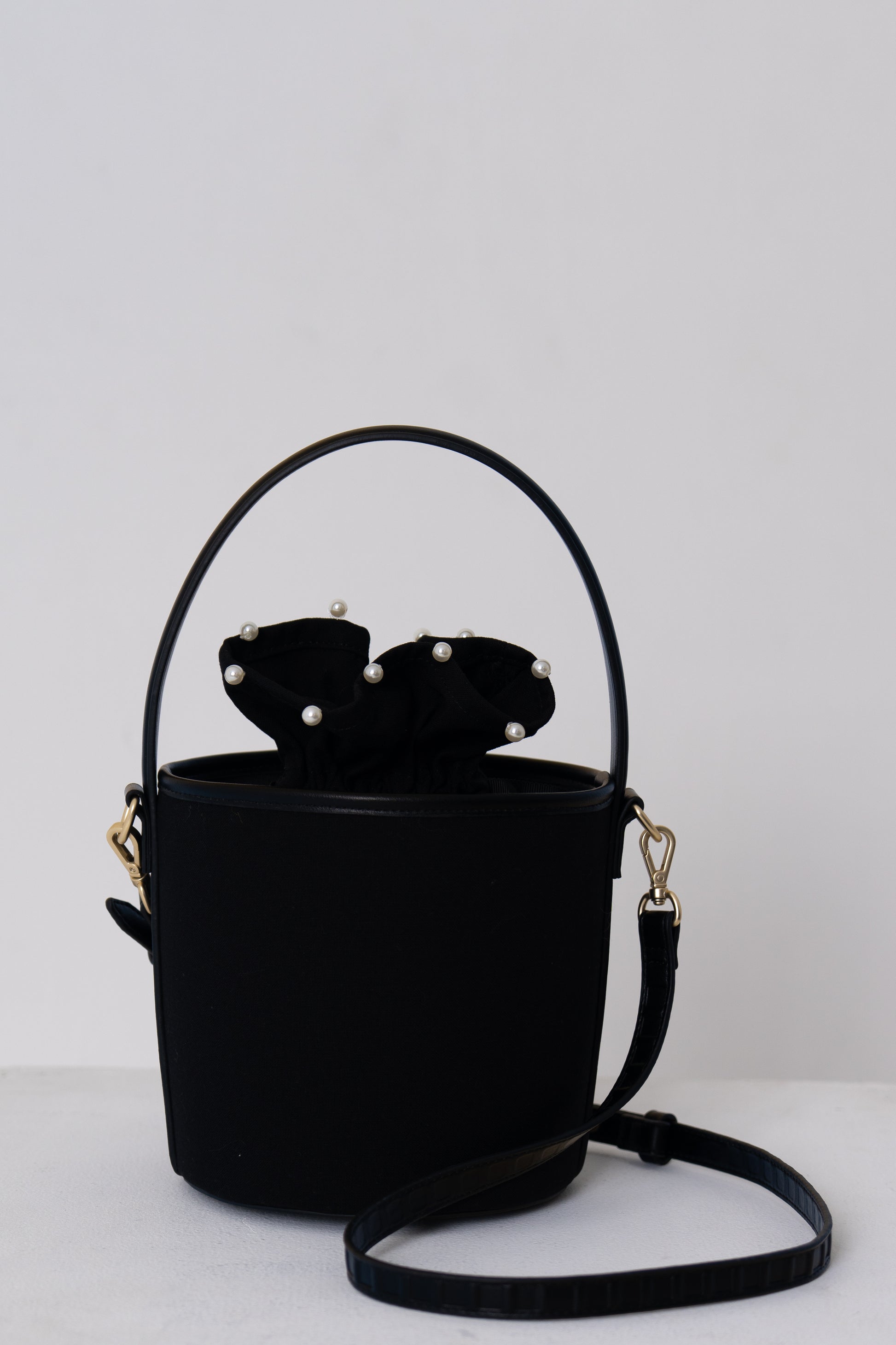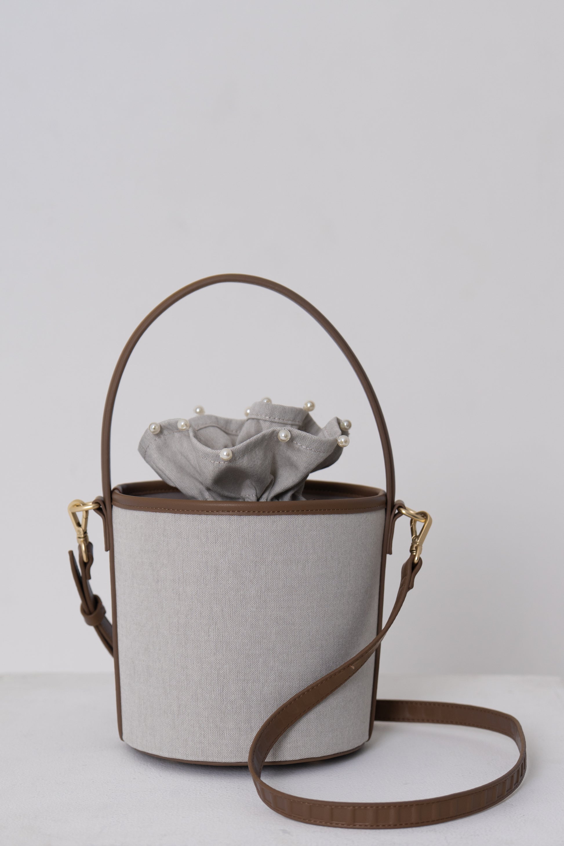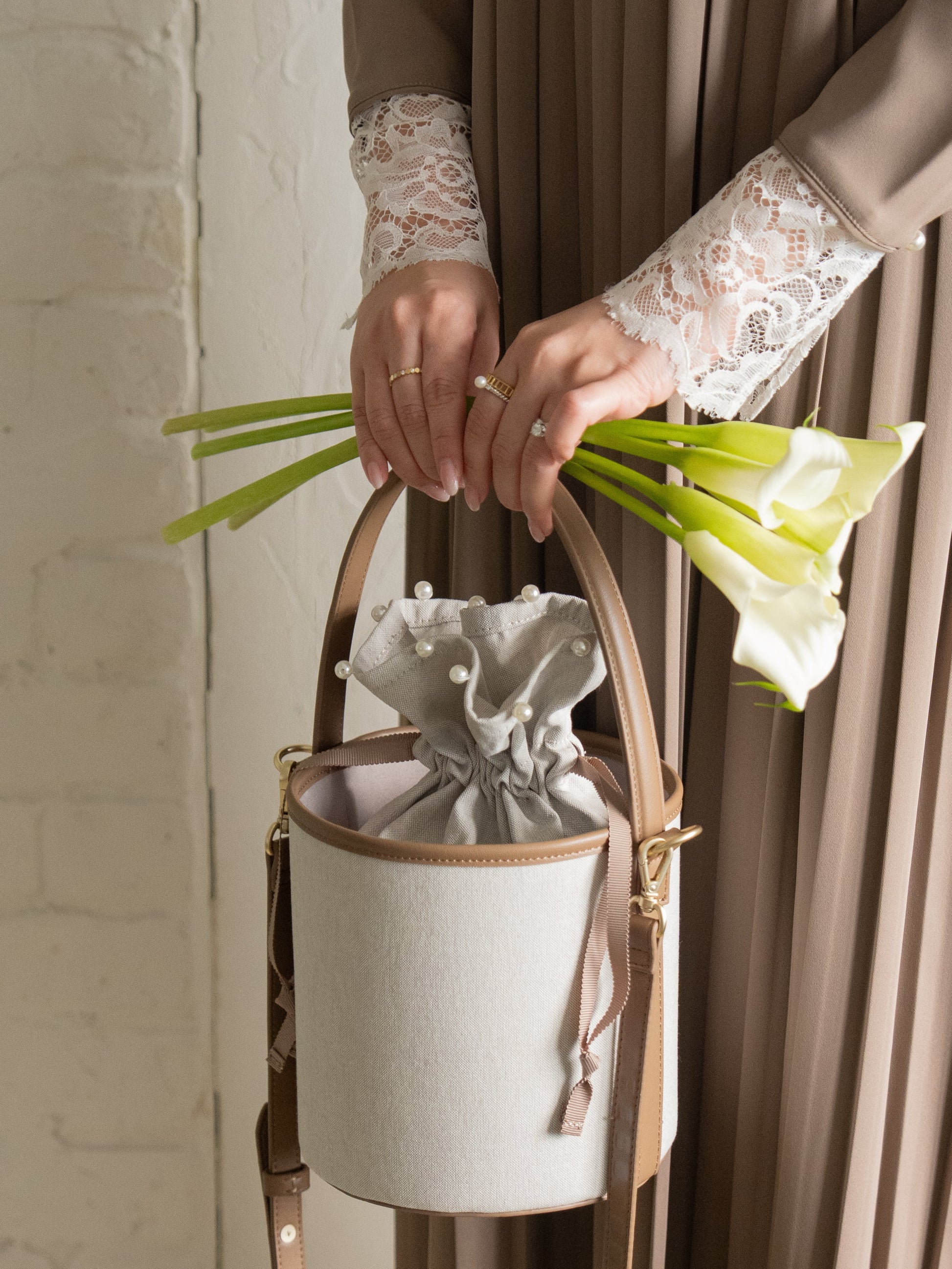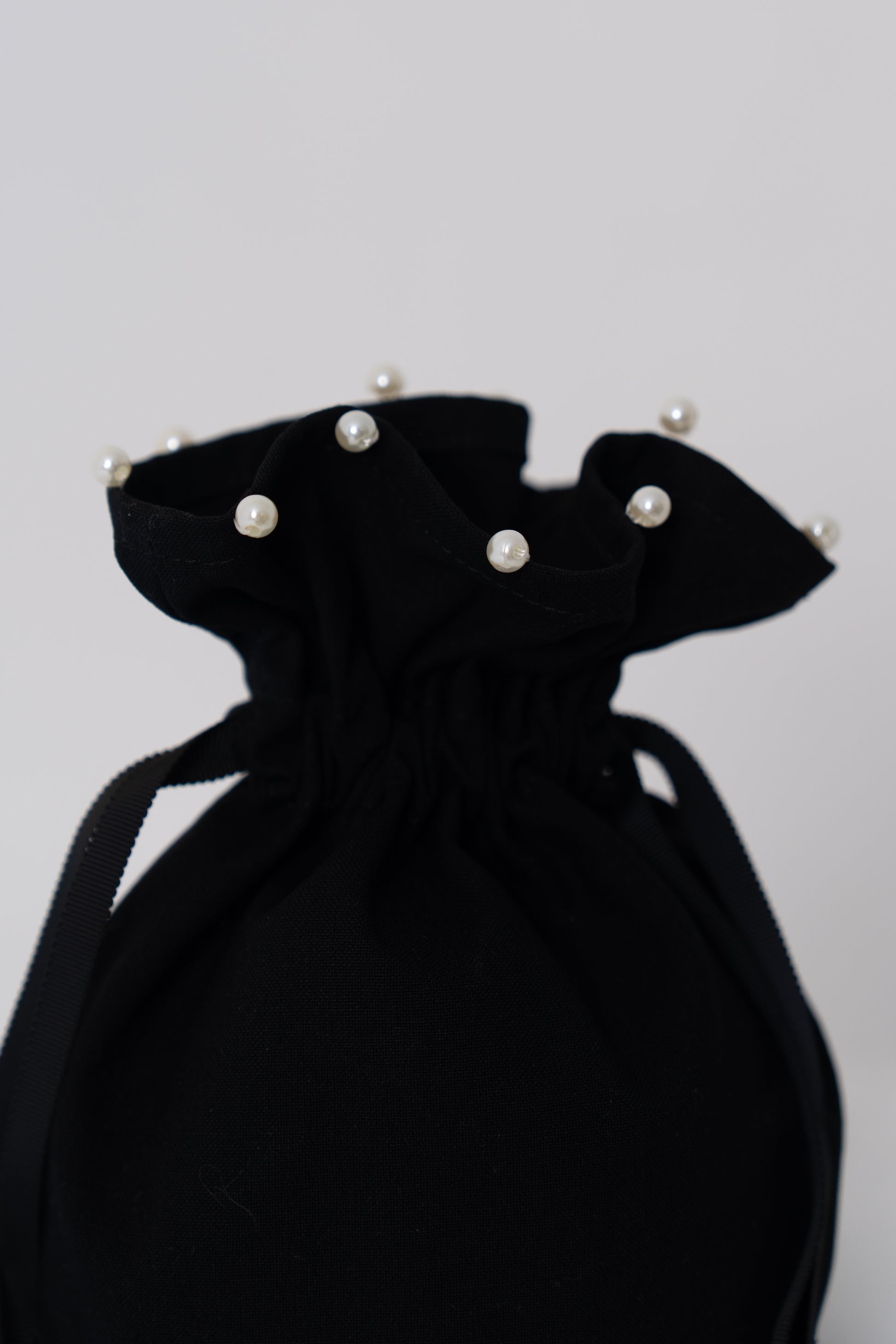 バッグに合わせて作られた共布の巾着は、上端にさりげないパールをあしらい、上品なアクセントに。