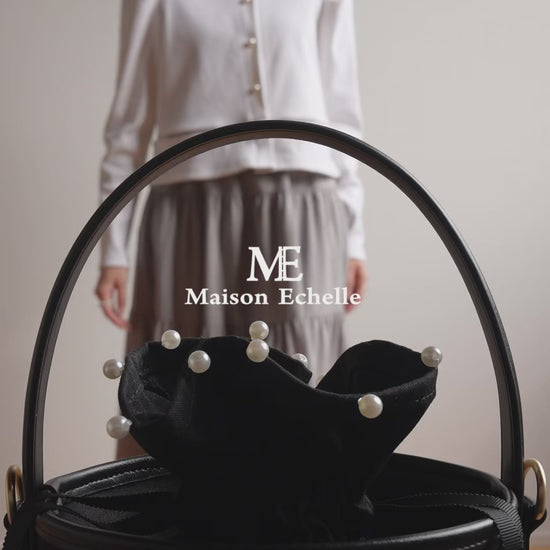 バッグに合わせて作られた共布の巾着は、上端にさりげないパールをあしらい、上品なアクセントに。