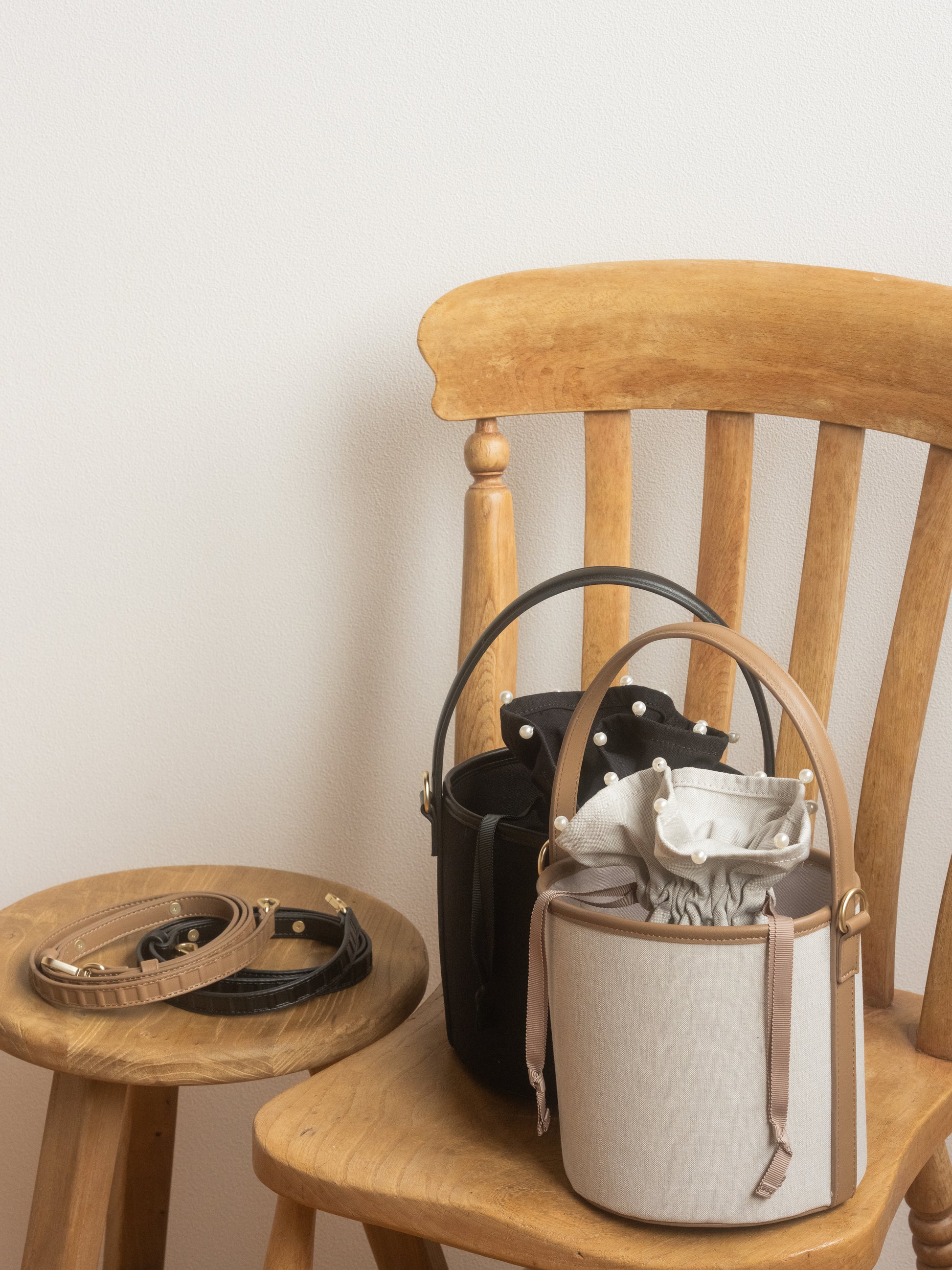 バケツバッグと同じ生地で仕立てているため、セットで使えば統一感のあるコーディネートが完成します。
