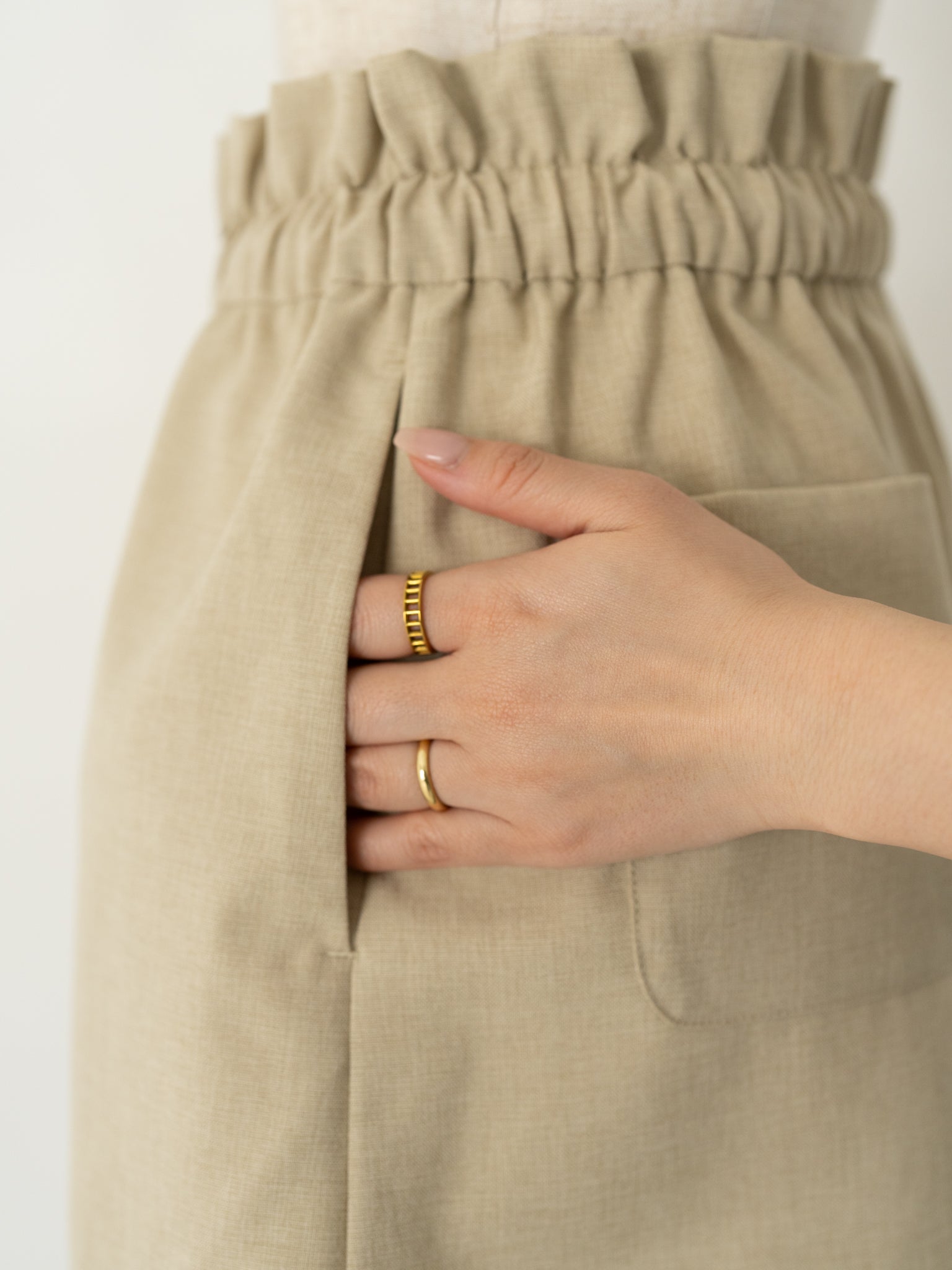 トップスをインした際も、ウエスト周りにあしらったフリルデザインが自然な立体感を生み、カジュアルになりすぎず着こなしていただけます。