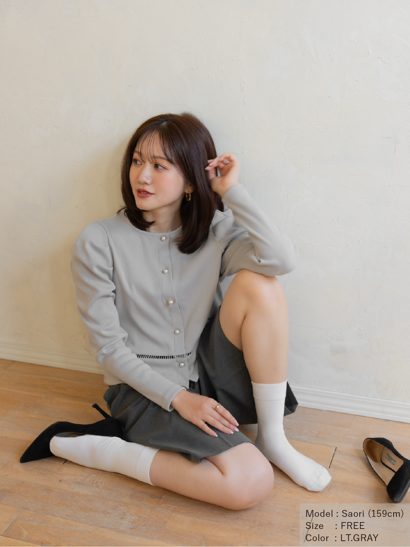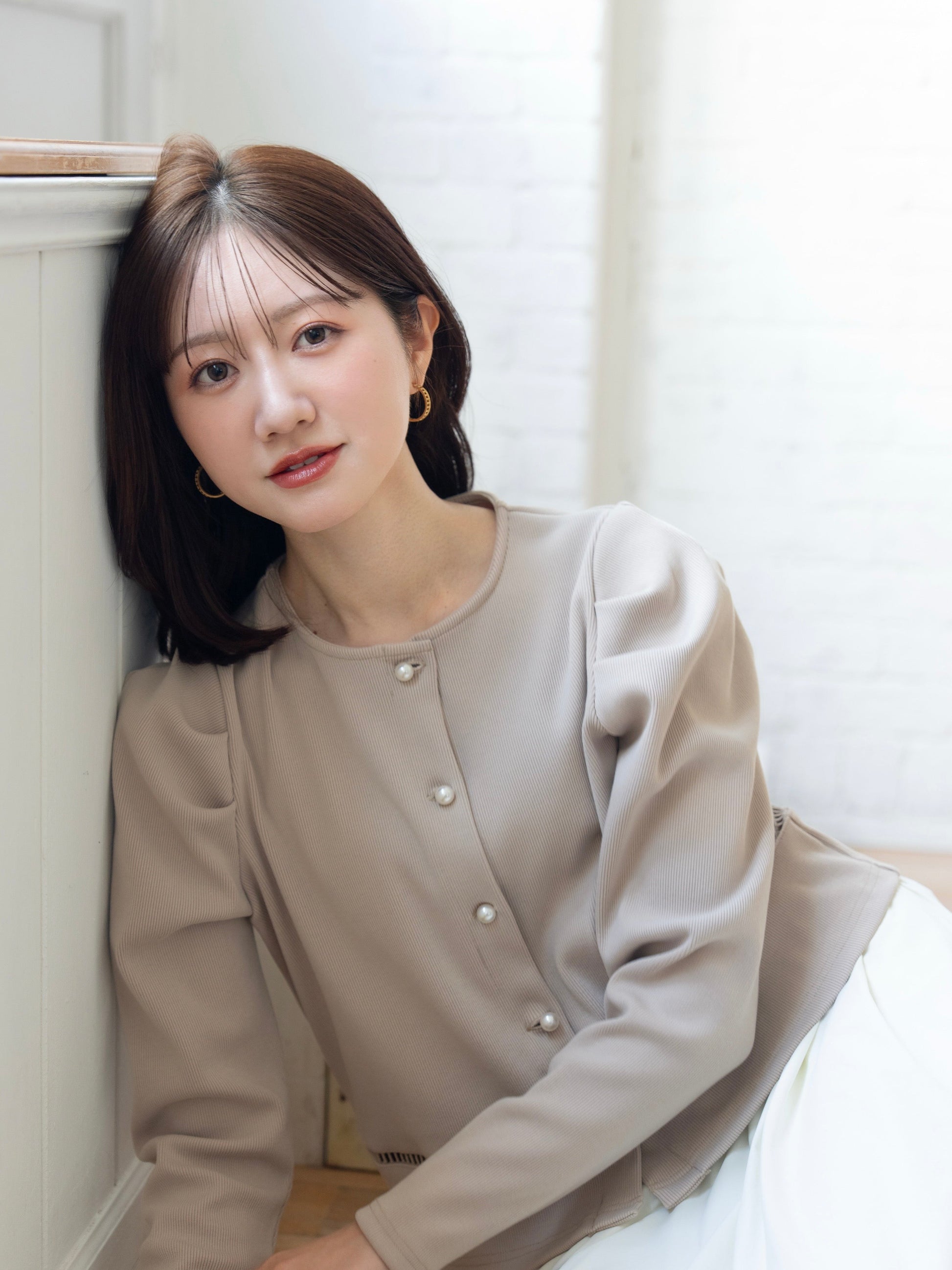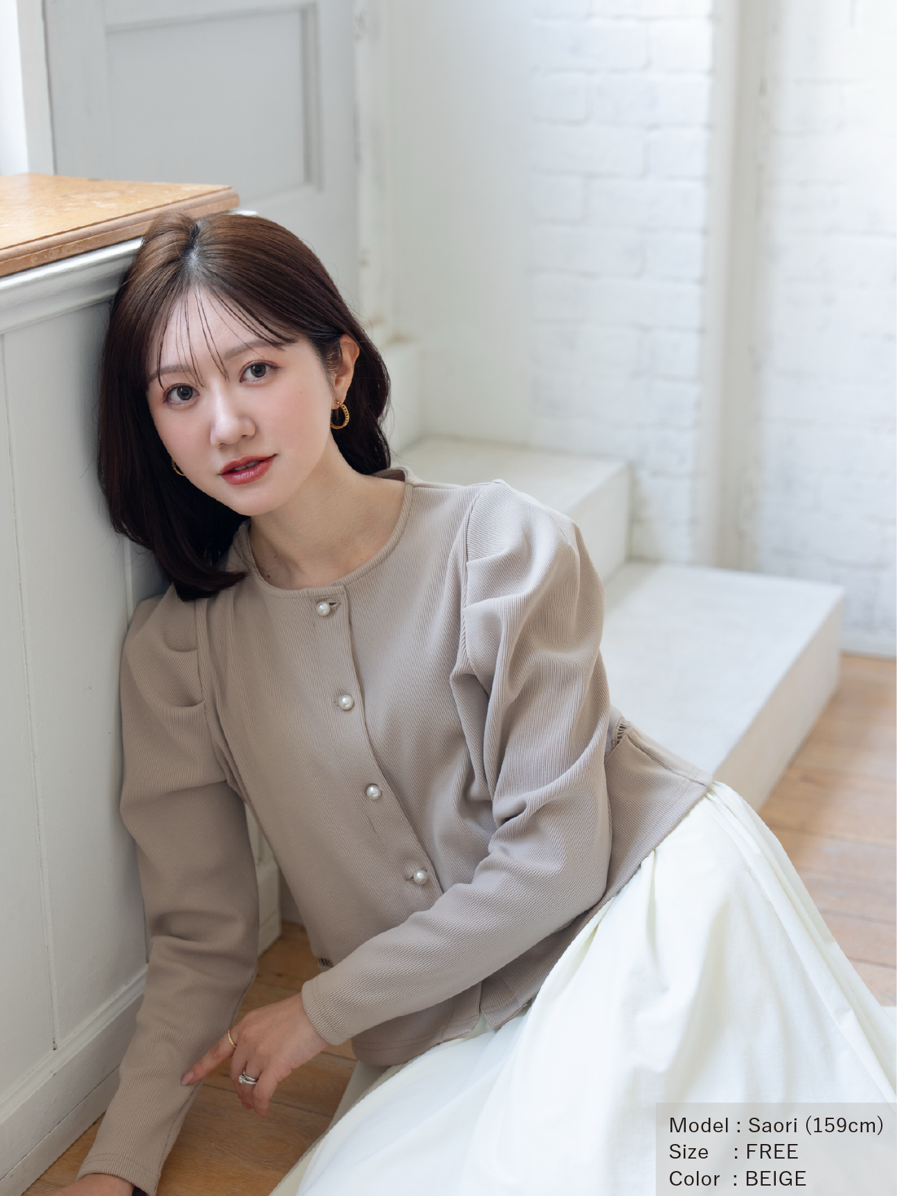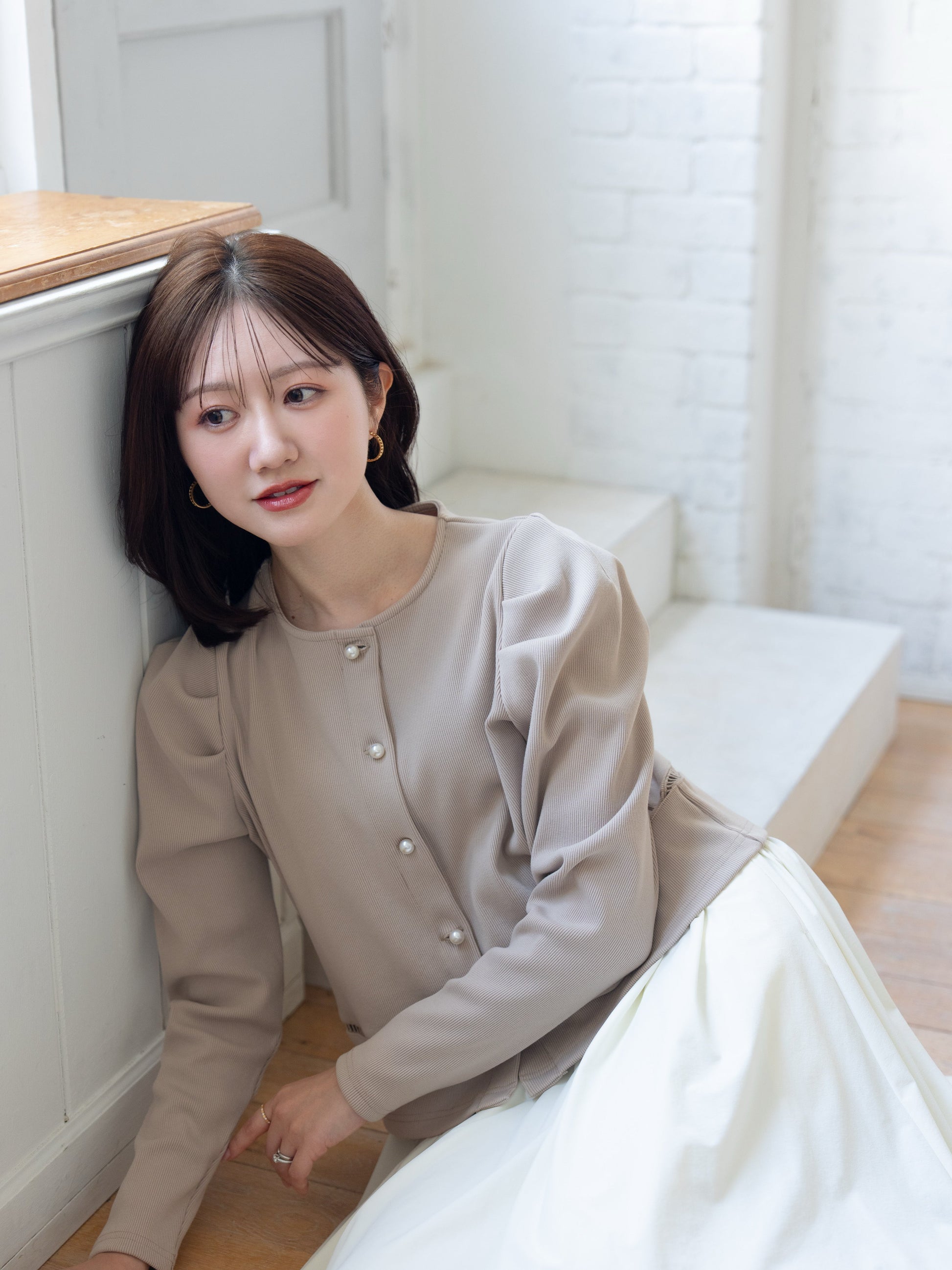 まんまるパールのボタンが愛らしいリブカーディガン。