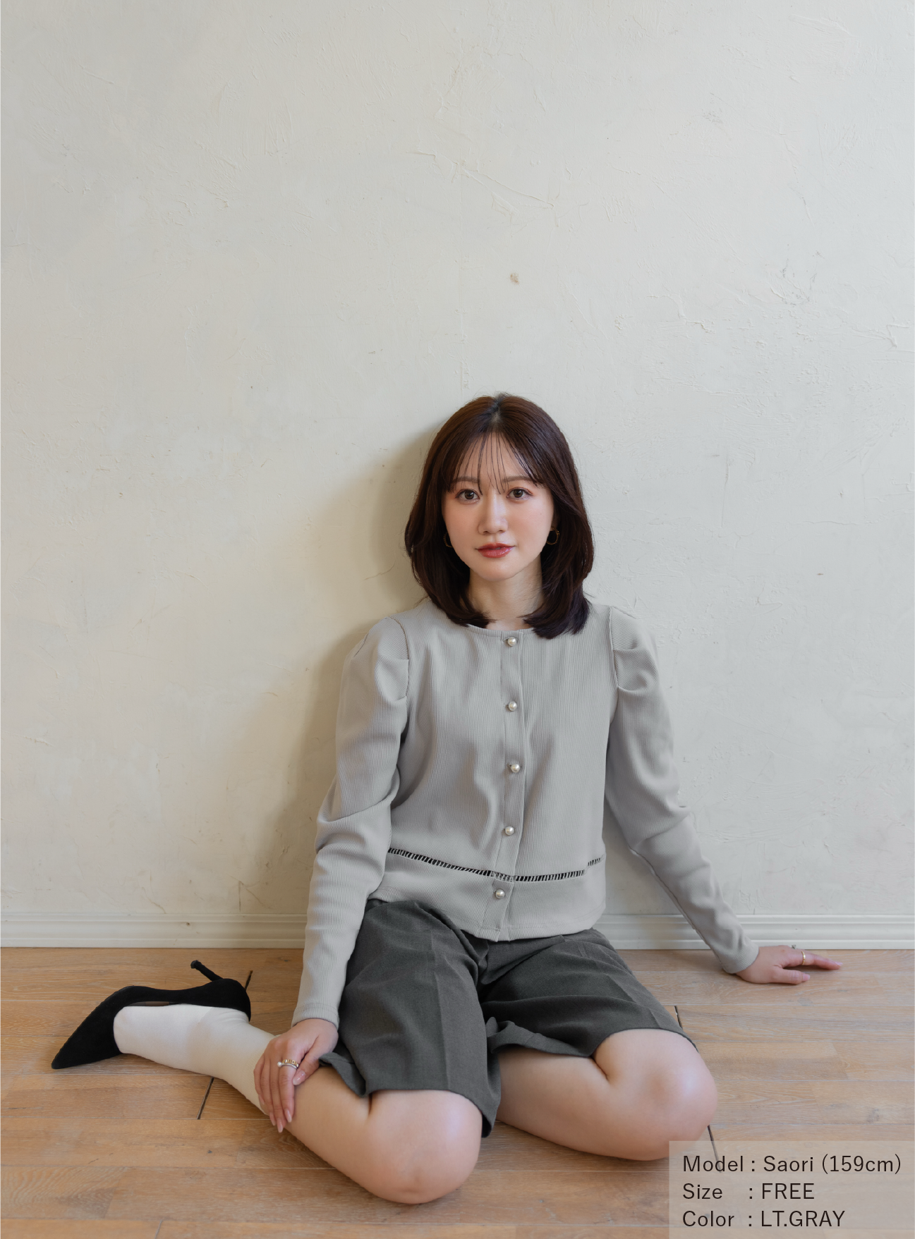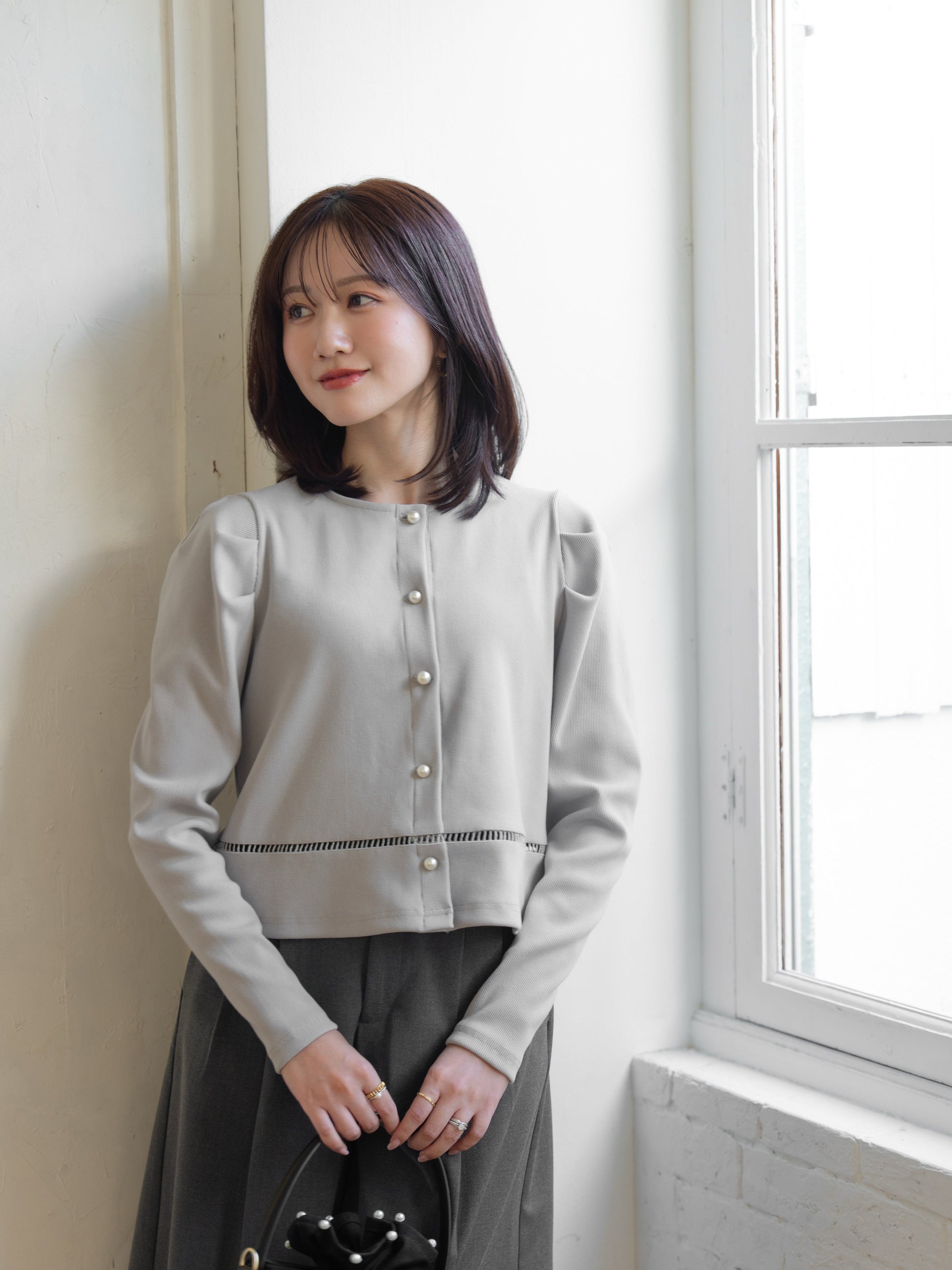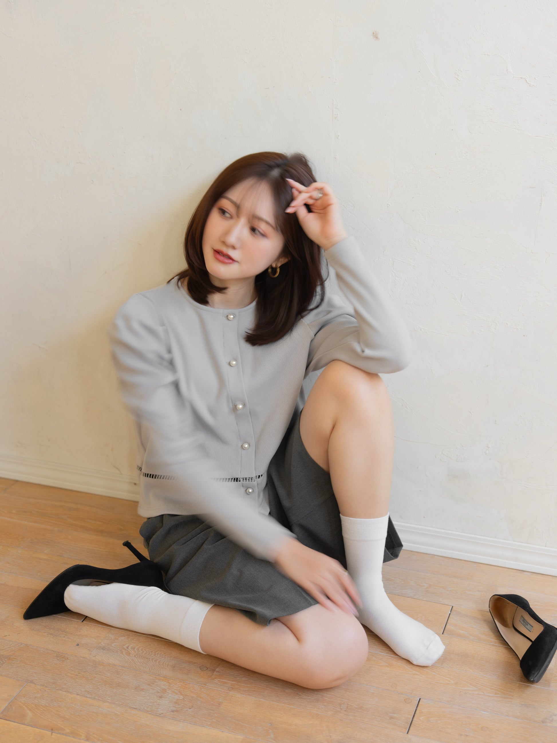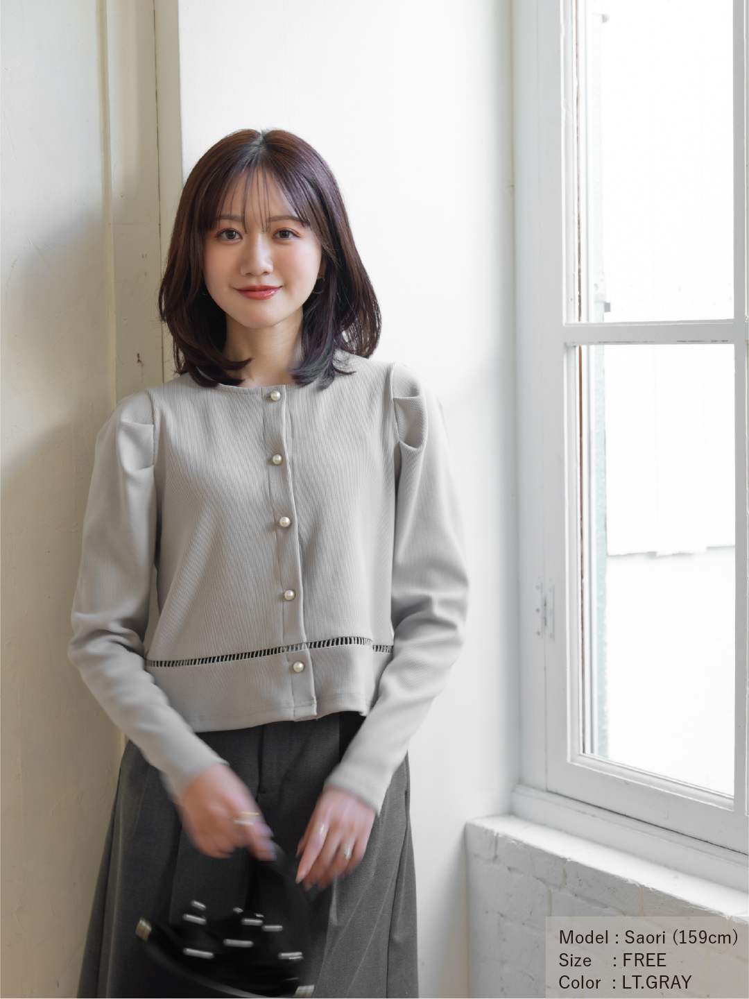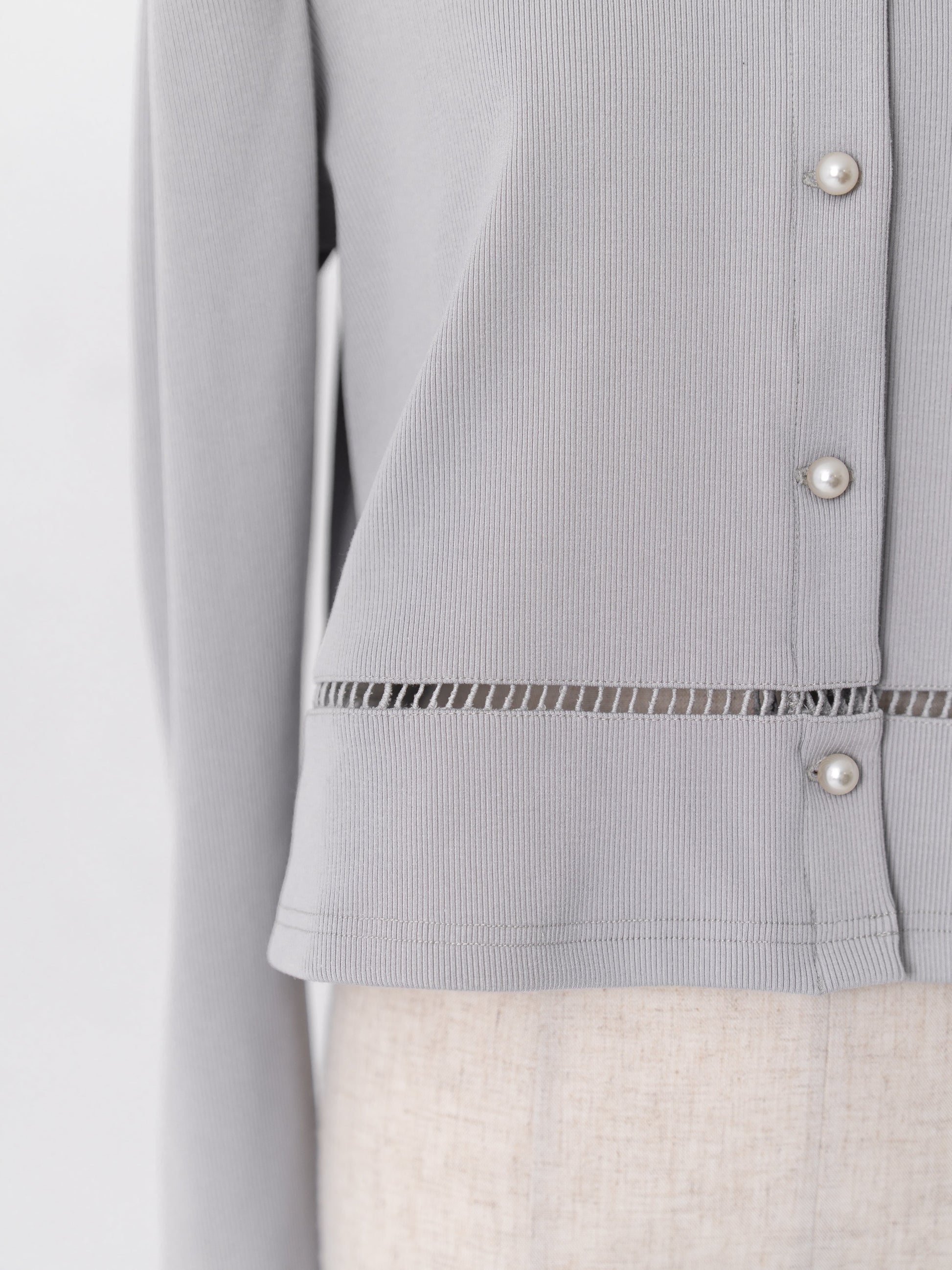 まんまるパールのボタンが愛らしいリブカーディガン。