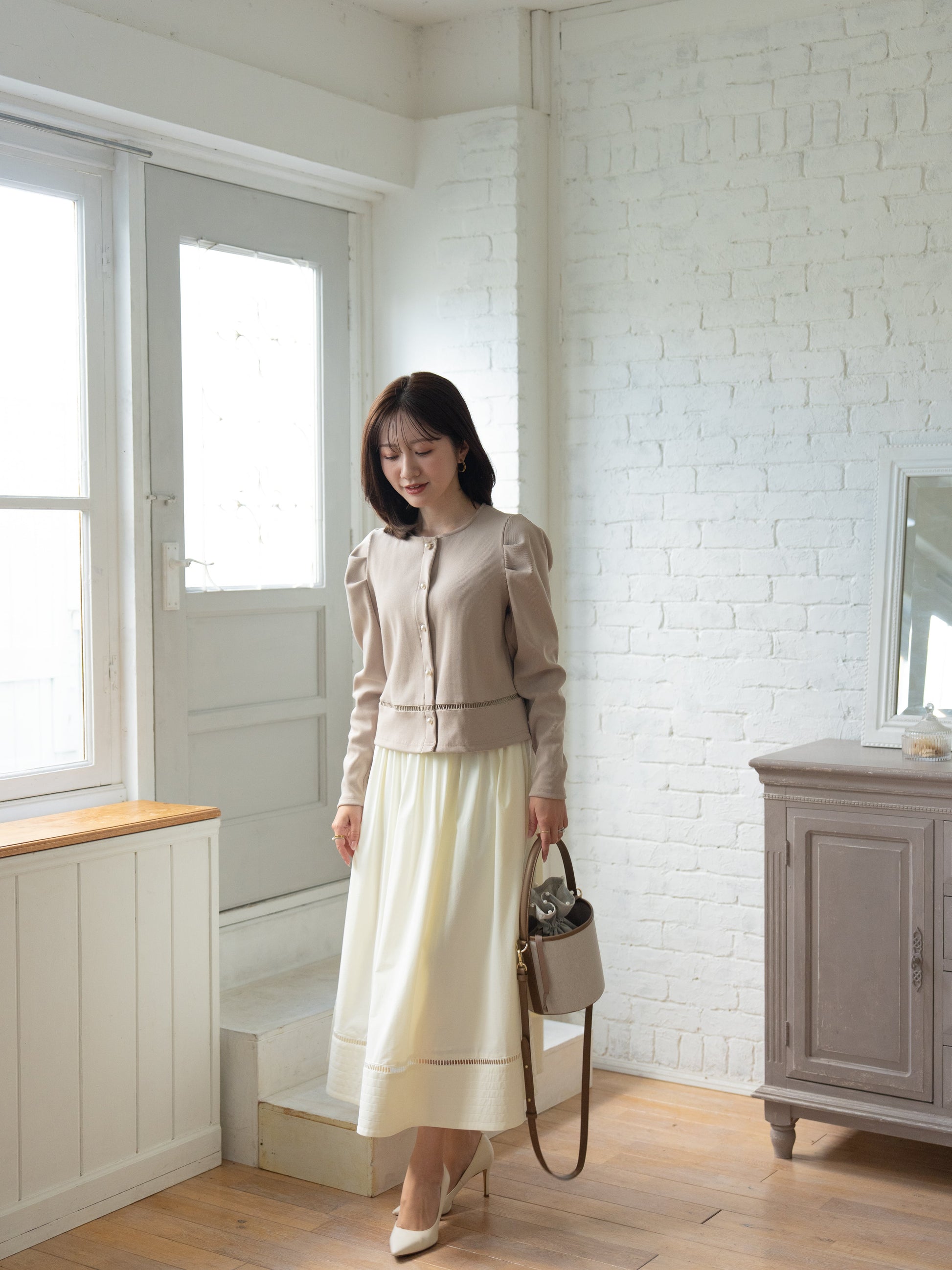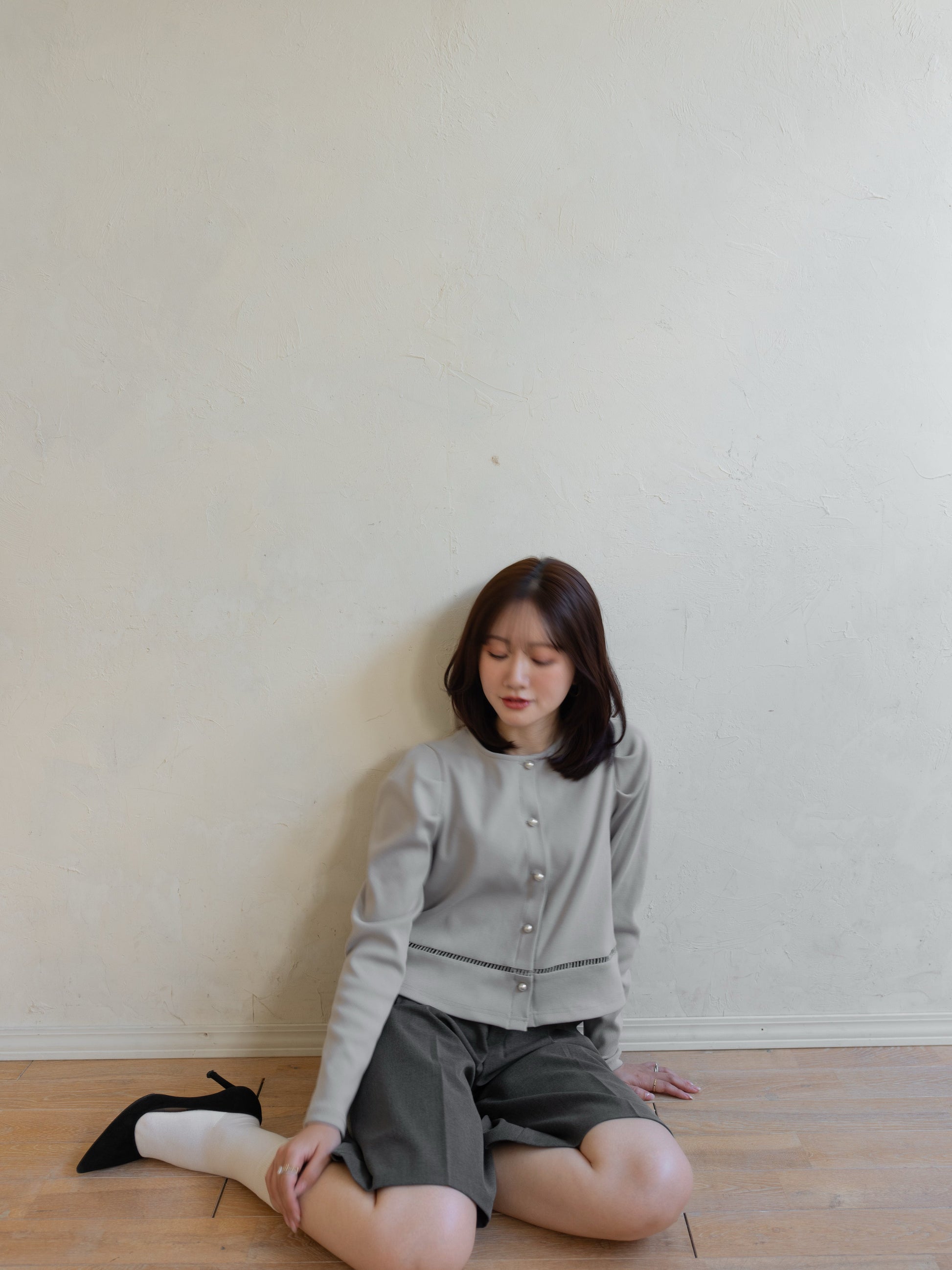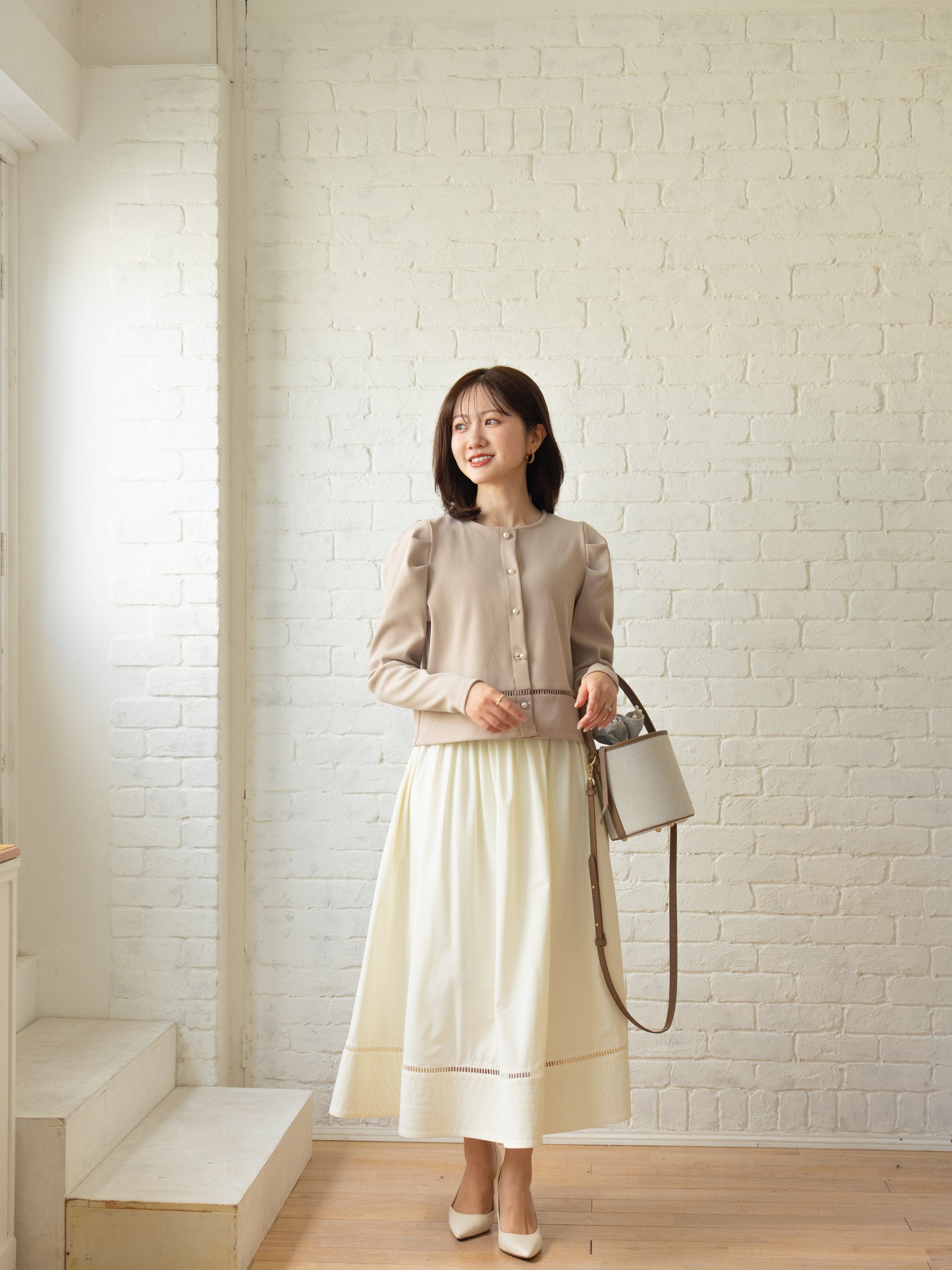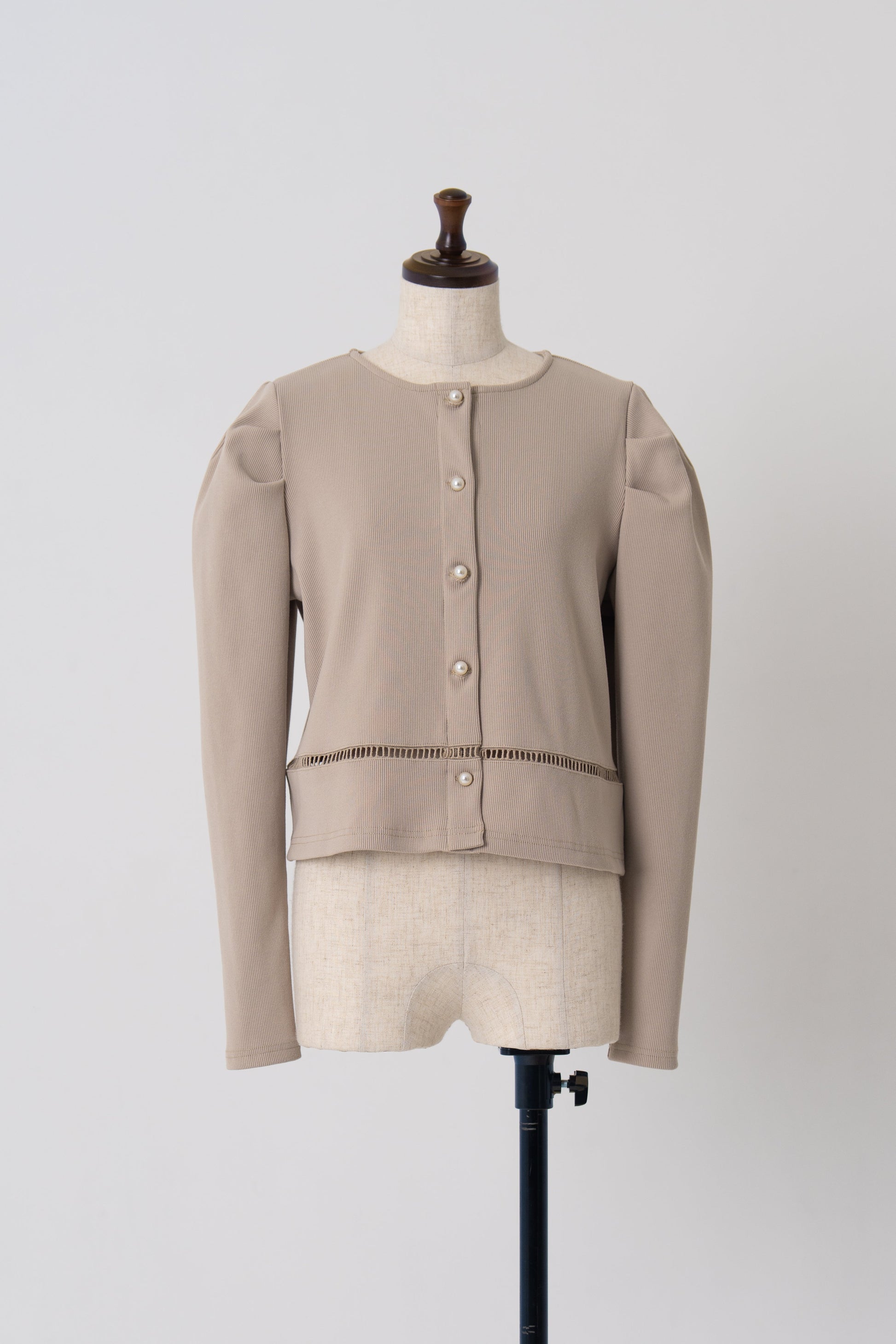 まんまるパールのボタンが愛らしいリブカーディガン。