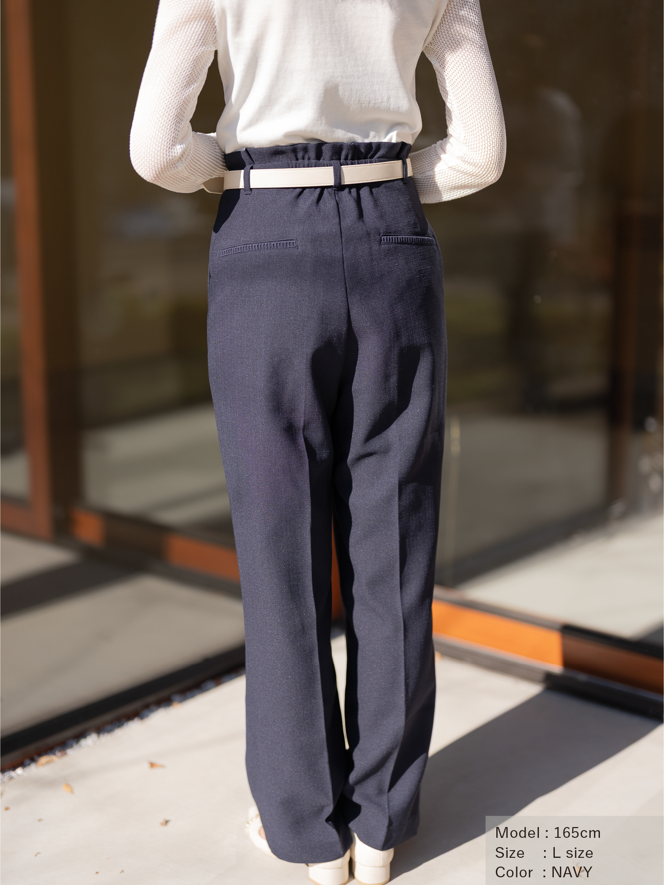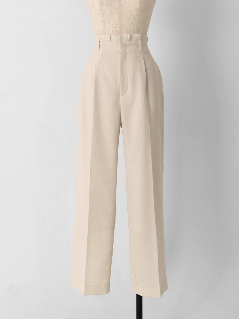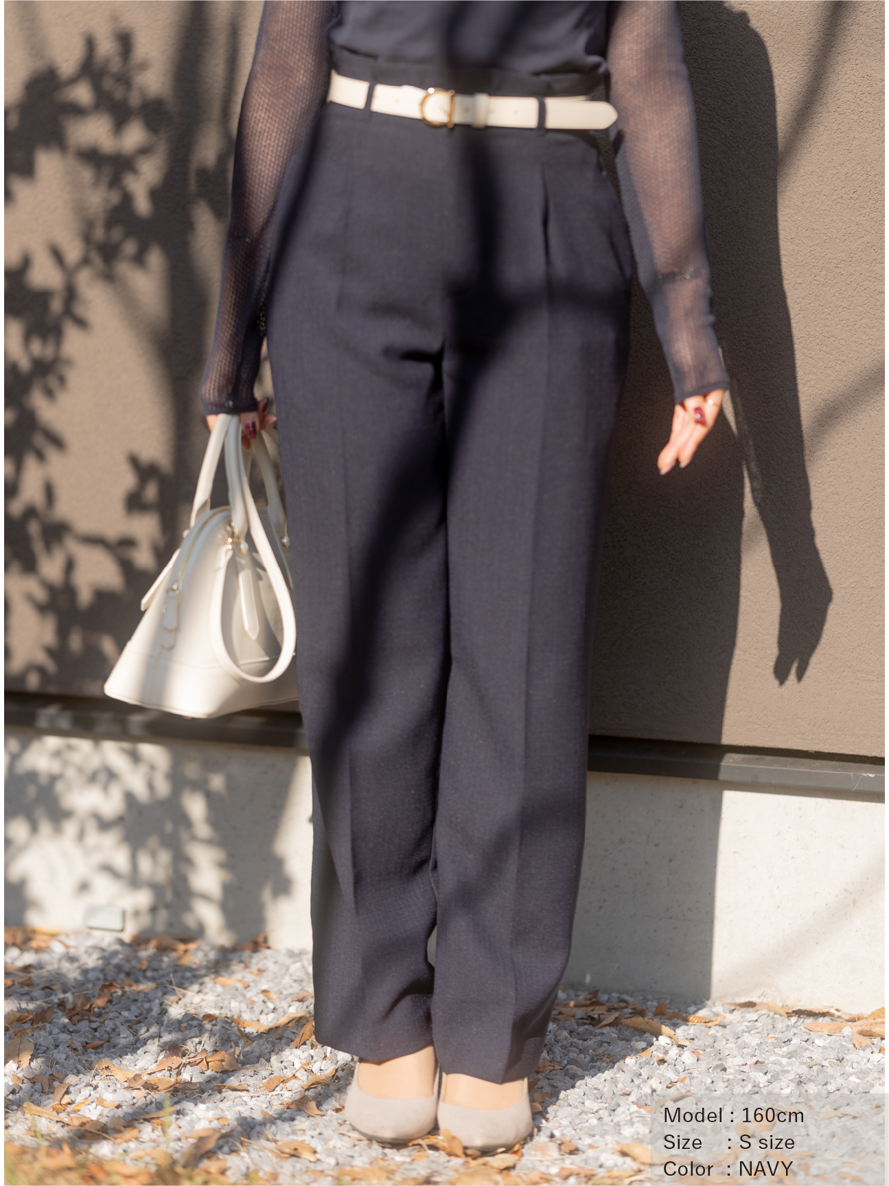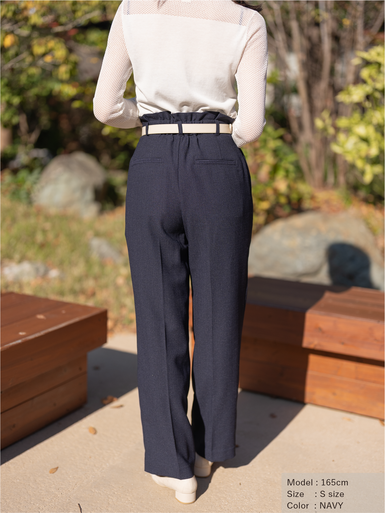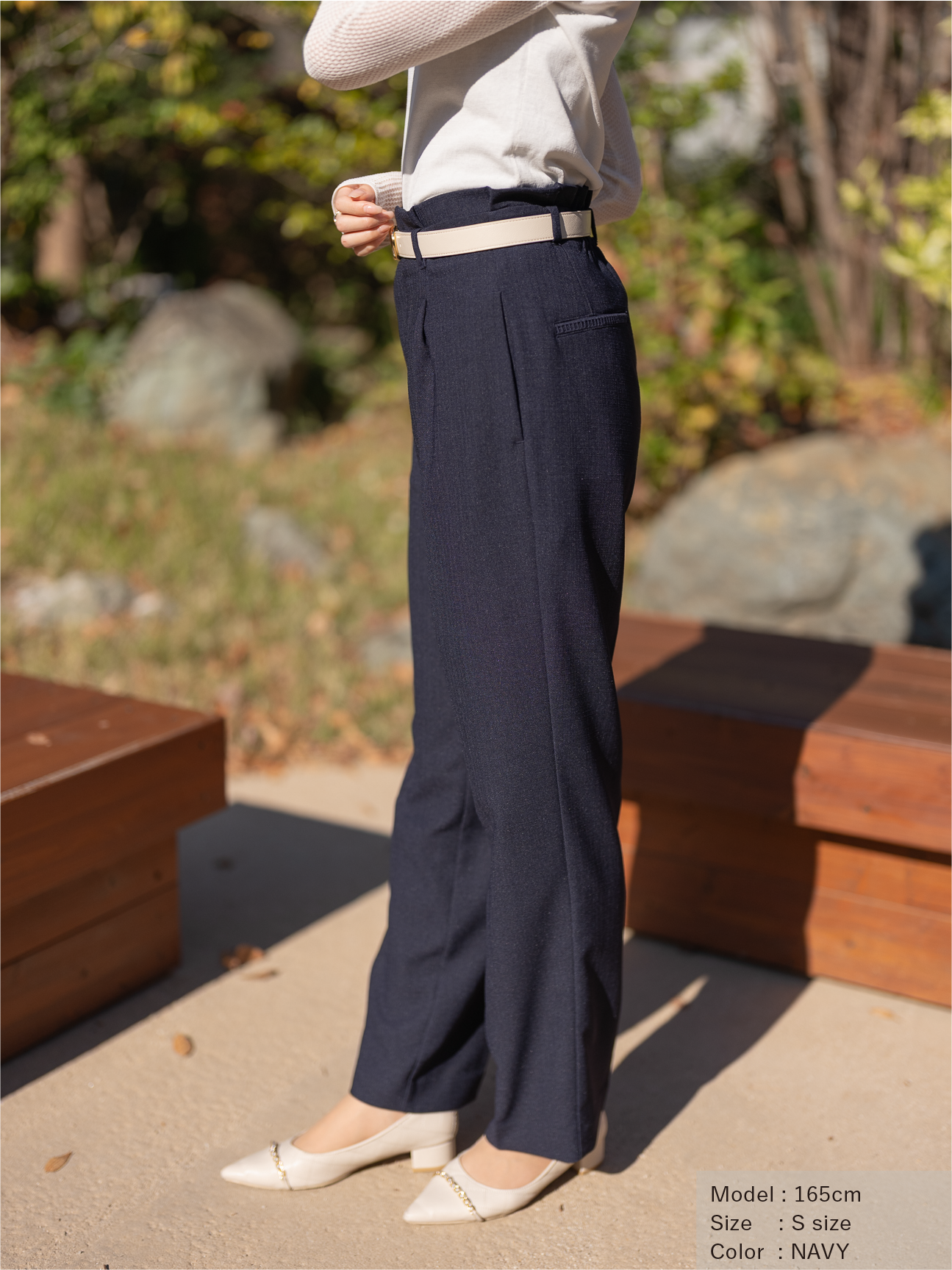 ややハイウエストのデザインに、センタープレスが上品な印象を添え、脚をまっすぐきれいに見せてくれます。