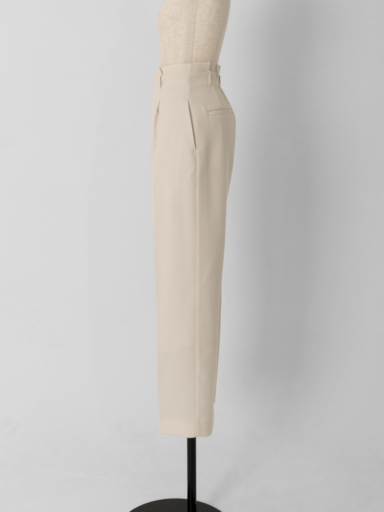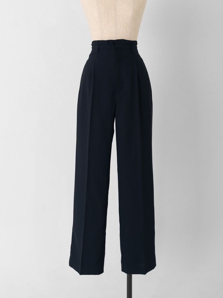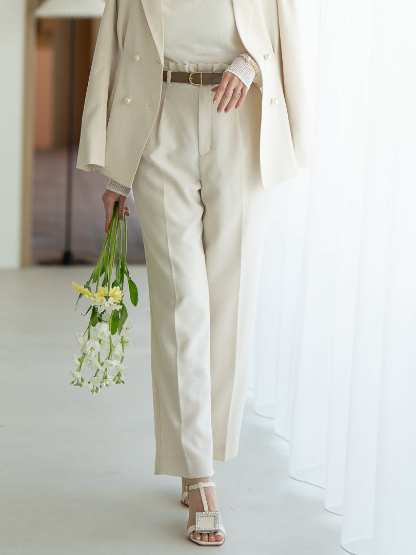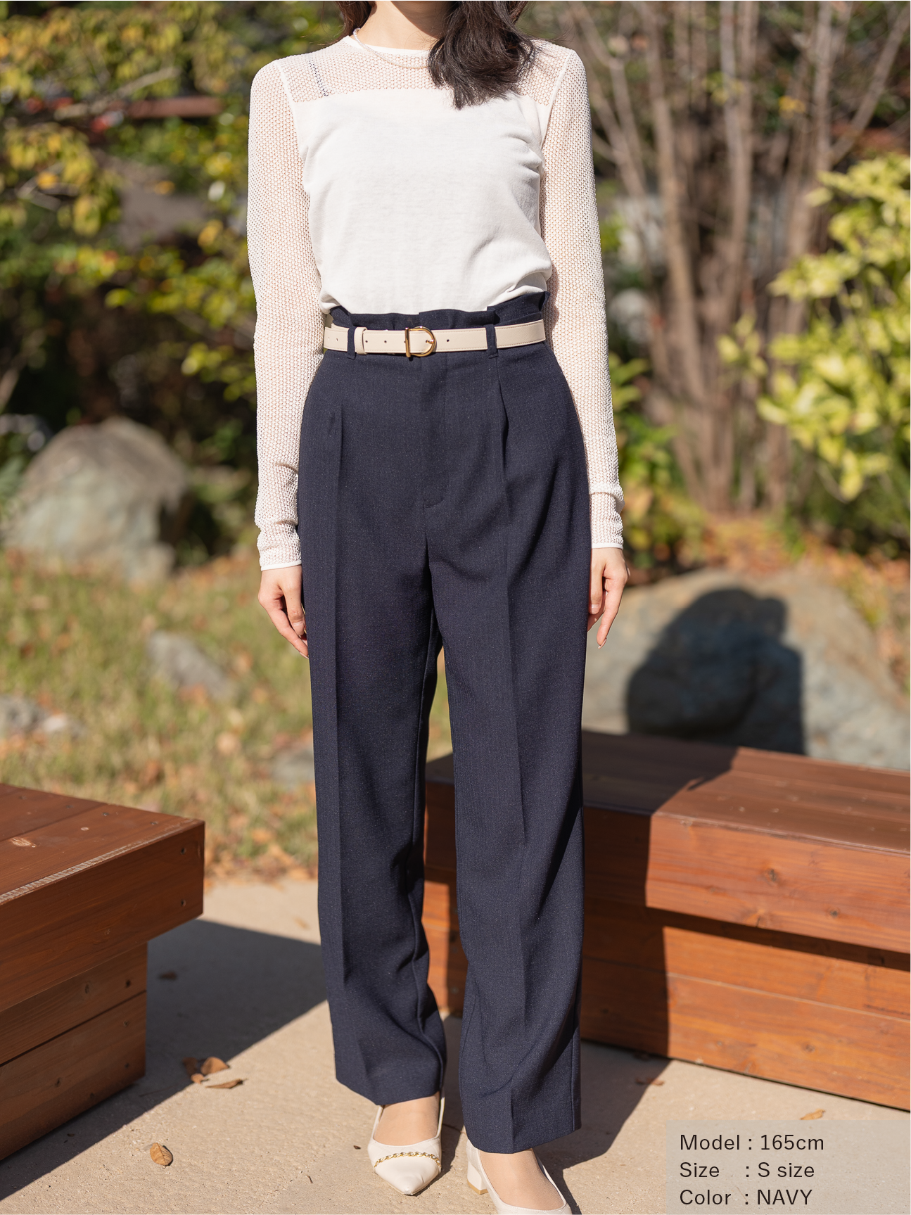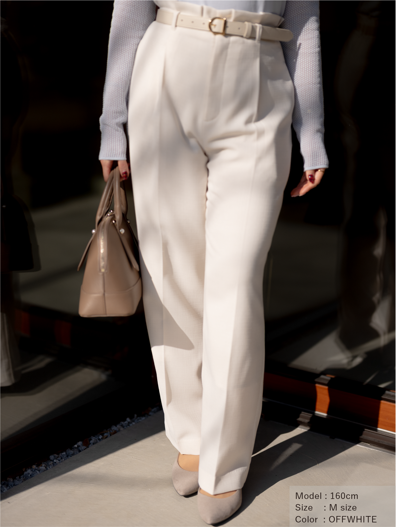 ややハイウエストのデザインに、センタープレスが上品な印象を添え、脚をまっすぐきれいに見せてくれます。
