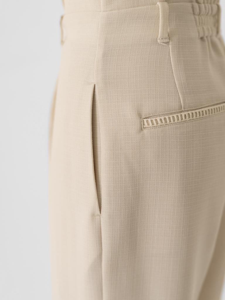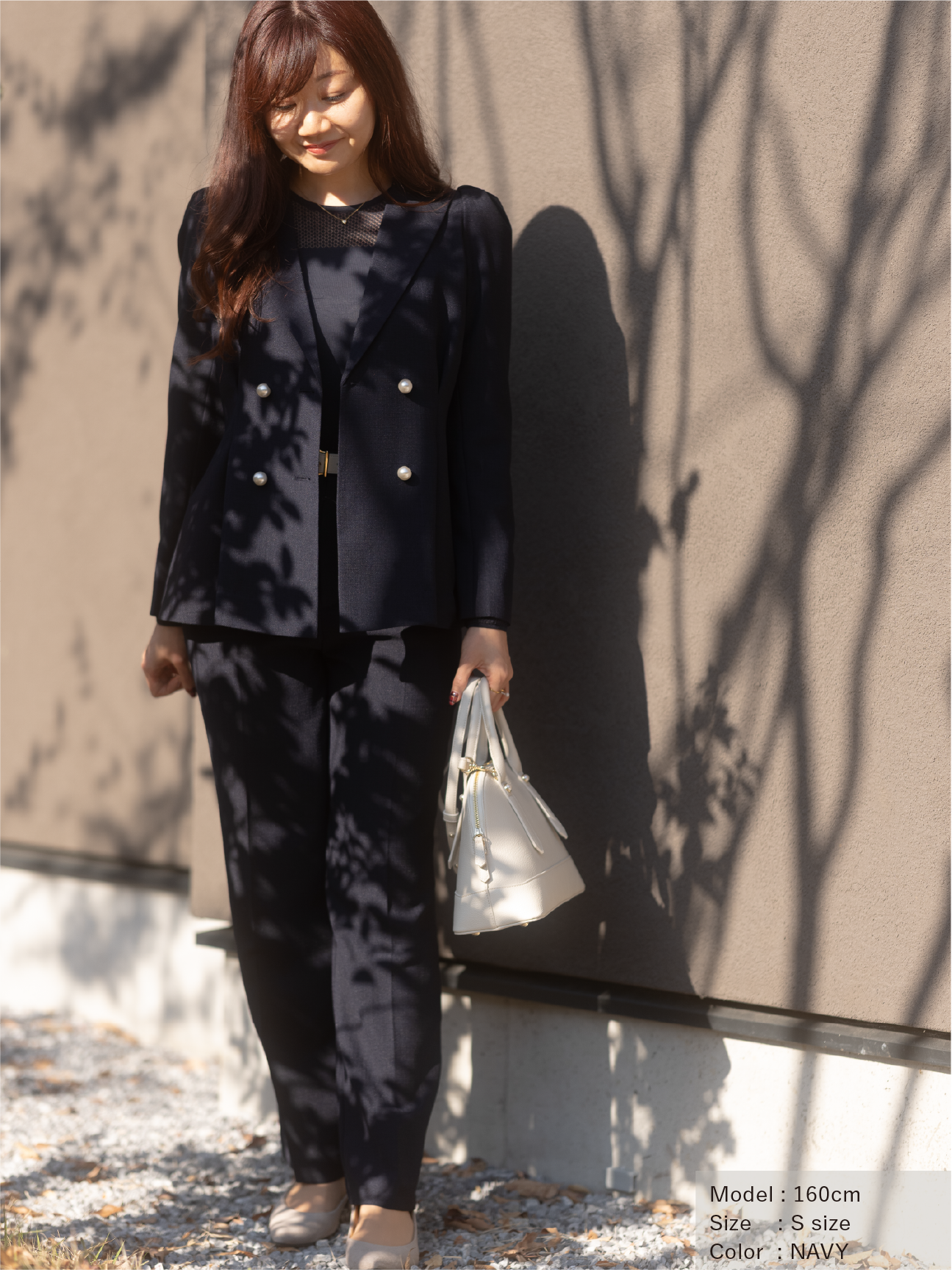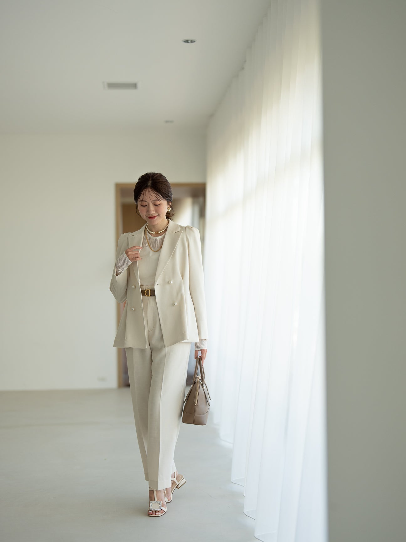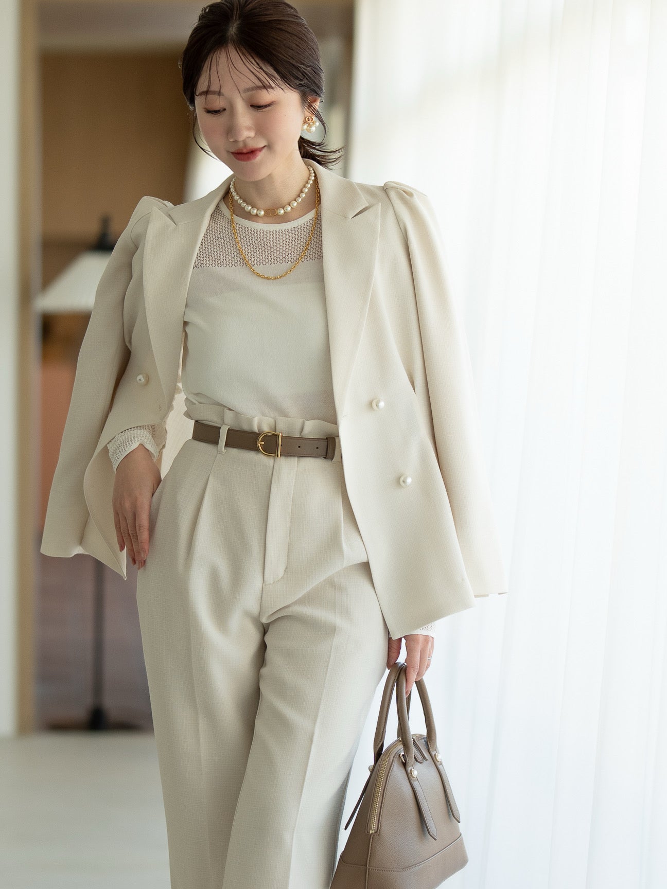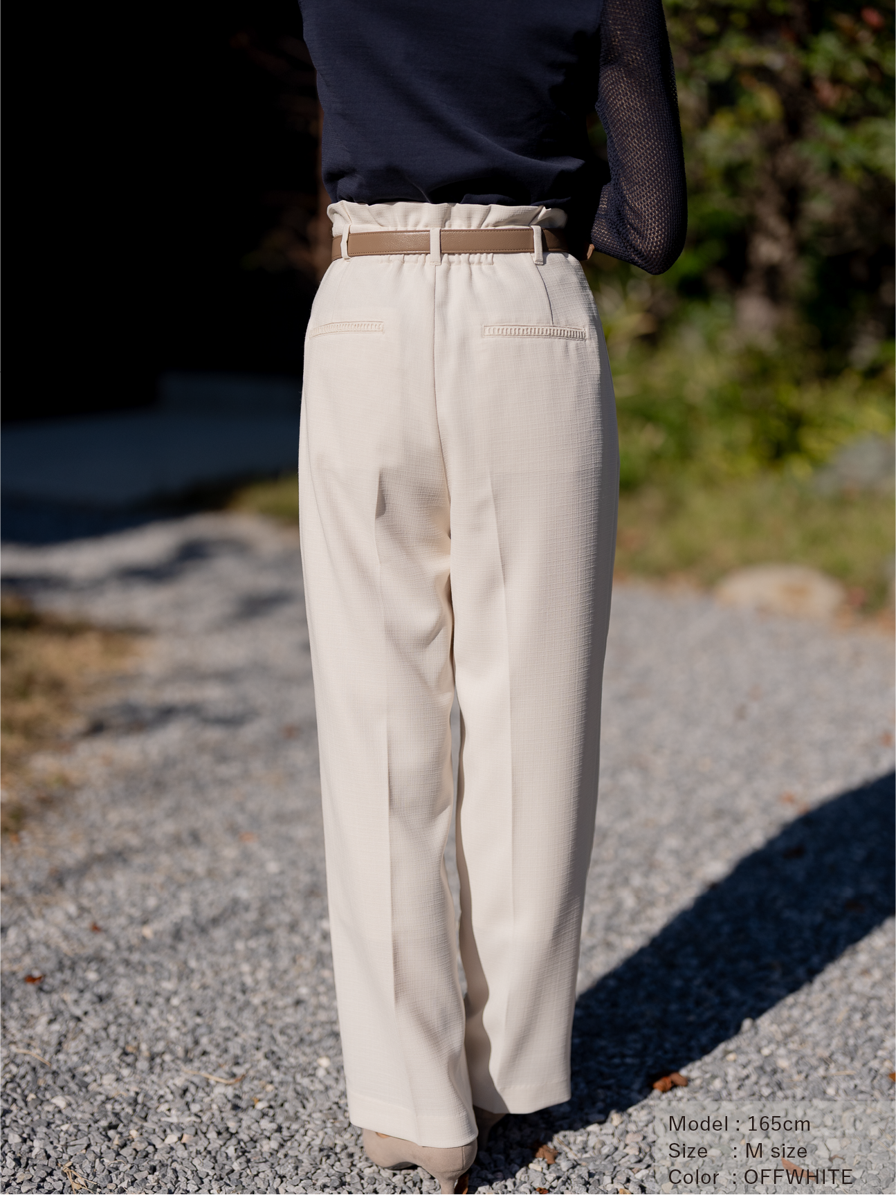 ややハイウエストのデザインに、センタープレスが上品な印象を添え、脚をまっすぐきれいに見せてくれます。
